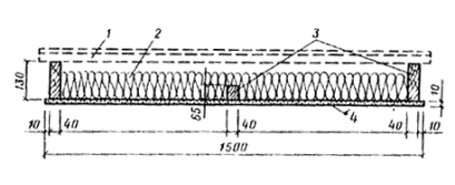 Рис. 1. Поперечное сечение плиты 1 – асбестоцементные листы УВ–75; 2 – утеплитель; 3 – бруски; 4 – асбестоцементный плоский лист Соединение обшивки с каркасом на шурупах диаметром 4 мм с шагом 250 мм. Плита свободно опирается по коротким сторонам. Расчетный пролет 3 м. Влажность воздуха внутри помещения 75 %, температура 17 °С. Определение напряжений в крайних ребрах каркаса и обшивке плиты А. Определение нагрузок Результаты определения нагрузок приведены в табл. 5. Величины кратковременных и длительных нагрузок приведены в табл. 6. Суммарная расчетная нагрузка на крайнее ребро плиты равна: