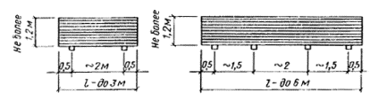 Каждая стопа укладывается на подкладки, устанавливаемые параллельно торцам и обеспечивающие устойчивое положение панелей, в соответствии с нижеприведенной схемой (рис. 8); при хранении панелей высота стопы не должна быть более двойной ширины панелей (1,2 м).