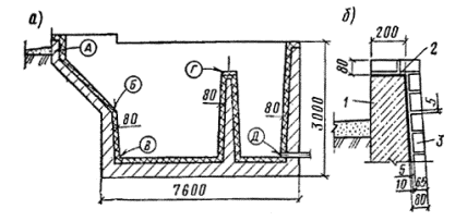 Рис. 1. Емкость для хранения сернокислого алюминия (перекрытие - съемные деревянные щиты) а - общий вид емкости; б - узел защиты верхней части корпуса А; в - узел защиты корпуса Б; г - узел защиты корпуса и днища В; д - узел защиты верхней части перегородки Г; е - узел установки штуцера из коррозионно-стойкой стали Д; 1 - корпус и днище железобетонные; 2 - полиизобутилен ПСГ; 3 - кирпич кислотоупорный; 4 - перегородка железобетонная; 5 - решетка металлическая; 6 - штуцер с фартуком из коррозионно-стойкой стали; 7 - химически стойкое уплотнение Пример 2. Усреднитель хромсодержащих стоков с габаритами 6600´1800´2300 (h). Установлен в здании. Подробные условия эксплуатации изложены в поз. 2 Задания. Из перечня компонентов гр. 5 Задания агрессивными являются Na2Cr2O7 и H2SO4, которые вызывают коррозию II вида (кислотную) при величине рН = 3 - 4. По табл. 5(5) при рН = 3 - 4 степень агрессивного воздействия среды к бетону марки по водонепроницаемости W8 оценивается как среднеагрессивная, a W6 - сильноагрессивная. Принимаем бетон марки по водонепроницаемости W8. Содержание аммонийной соли (NН4)2Сr2О7 может оказывать влияние на коррозию бетона, но концентрация соли в растворе мала и в пересчете на ион NH4+ неагрессивна к бетону с маркой по водонепроницаемости W8. По табл. 18(13) для среднеагрессивной среды могут быть применены мастичные, оклеечные или облицовочные (футеровочные) покрытия III - IV группы. Усреднитель относится к очистным сооружениям. В соответствии с табл. 23 и «Руководством по проектированию защиты от коррозии железобетонных резервуаров очистных сооружений» (ММСС, СССР, 1981) для среднеагрессивной среды рекомендуется толстослойное лакокрасочное (мастичное) покрытие на основе модифицированных эпоксидных материалов. Учитывая, однако, опыт проектирования аналогичных емкостей и особенности эксплуатации, принимаем покрытие не III, а IV группы, вариант I эпоксидно-сланцевый состав. Покрытие принято с учетом малой концентрации компонентов агрессивной среды и экономии дефицитных дорогостоящих эпоксидных материалов в соответствии с ТП 101-81*. В связи с наличием шлама на днище емкости и необходимостью периодического его удаления предусматриваем по днищу футеровку кислотоупорными штучными материалами. Принимая во внимание конструктивные особенности емкости и необходимость защиты днища и стенок на высоту образования шлама (Н = 300 мм от наиболее высокой точки днища), футеровка принята кислотоупорным кирпичом в 1/4 из условия ее статической устойчивости. Опорные столбики под барботер для перемешивания раствора выполнены в виде кладки из кислотоупорного кирпича с сохранением заданной отметки верха. Штуцер слива защищается кислотоупорным вкладышем. Покрытие емкости из монолитного железобетона с двумя люками диаметром 800 мм окрашивается эпоксидно-сланцевыми материалами аналогично защите корпуса емкости. Узлы защиты даны на рис. 2.