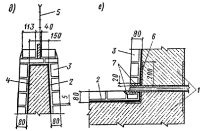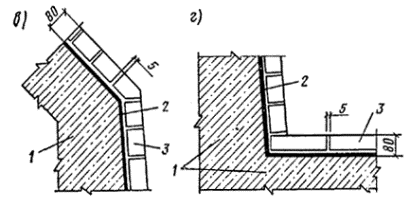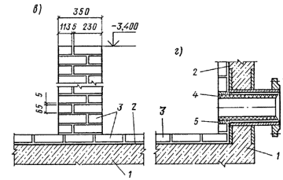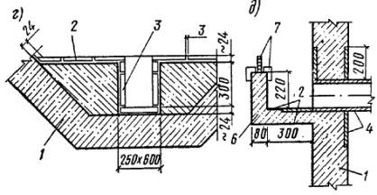 Рис. 3. Нефтеловушка (перекрытие - съемные деревянные щиты) а - общий вид; б - узел защиты днища и корпуса А; в - узел установки штуцера из коррозионно-стойкой стали Б; г - узел защиты приямка в днища В; д - узел защиты внутреннего переливного лотка Г; 1 - корпус и днище железобетонные; 2 - эпоксидно-сланцевое покрытие ЭСД-2; 3 - плитка кислотоупорная керамическая КШ-20; 4 - штуцер с фартуком из коррозионно-стойкой стали; 5 - химически стойкое уплотнение; 6 - лоток железобетонный; 7 - деревянная доска и крепление Дымовые, газодымовые и вентиляционные трубы5.2 (2.50 - 2.56). Трубы по назначению разделяются на: дымовые и газодымовые - отводящие дым и газовоздушные смеси, образующиеся при сжигании различных видов топлива. В смесях содержатся газы среднеагрессивные или неагрессивные, взвеси сажи, золы и пыли. Влажность дымо- и газовоздушных смесей не превышает 60 %, температура от 70 - 600 °С; вентиляционные - отводящие слабоагрессивные, среднеагрессивные или сильноагрессивные газовоздушные смеси от вентиляционных систем или местных отсосов газовыделяющей аппаратуры или образующиеся при сжигании топлива для обжига и плавления различных материалов. Влажность слабоагрессивных или среднеагрессивных газовоздушных смесей не превышает 80 %. Температура 20 - 70 °С, периодически возможно образование конденсата. Влажность сильноагрессивных газовоздушных смесей достигает 95 %. Антикоррозионная защита труб устанавливается в зависимости от условий эксплуатации по среде и температуре и требований по рассеиванию дымовых газов с учетом конструктивного решения труб и определяется: высотой трубы, внутренним диаметром выходного отверстия; температурой, относительной влажностью и химическим составом отводимых газов; точкой росы удаляемых газов, возможностью образования и химическим составом конденсата на поверхности футеровки и несущего ствола; количеством, скоростью движения и статическим давлением или разрежением газов в газоотводящем стволе; суточными, месячными и годовыми изменениями условий эксплуатации; климатическим районом строительства трубы; способом возведения несущего ствола. Для железобетонного ствола дымовых и газодымовых труб с агрессивными газообразными средами, содержащими соединения серы, необходимо применять бетон на сульфатостойком портландцементе или сульфатостойком портландцементе с минеральными добавками. Допускается применение портландцементов с минеральными добавками, в клинкере которых содержание трехкальциевого алюмината c3a не превышает 7 % и общее количество C3A + C4AF £ 22 %. В качестве заполнителей для бетона труб следует применять фракционированный щебень плотных и прочных невыветренных изверженных пород водопоглощением не более 0,5 % и кварцевый или полевошпатовый песок с модулем крупности не менее 2,2. Требования к материалам и бетону труб приведены в «Инструкции по возведению монолитных железобетонных труб и башенных градирен» (ВСН 430-82 ММСС, СССР). Применение материалов с другими характеристиками для приготовления бетона несущих стволов труб производится по согласованию с проектной организацией. Защиту внутренней поверхности стволов железобетонных дымовых и газодымовых труб, а также наружных поверхностей участков зоны окутывания при температуре до 80 °С следует выполнять в зависимости от степени агрессивного воздейс