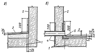 А. Выбор гидроизоляции пола определяется степенью агрессивности жидких сред и интенсивностью их воздействия (интенсивность воздействия принимать по СНиП). При малой интенсивности и слабой степени агрессивного воздействия среды должна быть предусмотрена окрасочная изоляция. При средней и большой интенсивности воздействия слабоагрессивных жидких сред или при малой интенсивности воздействия средне- и сильноагрессивной среды следует предусматривать оклеечную изоляцию, выполняемую из рулонных материалов на основе битумов или рулонных и листовых полимерных материалов. При большой интенсивности воздействия сильноагрессивной среды должна предусматриваться усиленная оклеечная изоляция. Усиленная изоляция должна предусматриваться также под каналами и сточными лотками с распространением ее на расстояние 1 м в каждую сторону. При проектировании полов на грунте в случае средней и большой интенсивности воздействия, средне- и сильноагрессивных сред должна дополнительно предусматриваться изоляция под подстилающим слоем независимо от наличия грунтовых вод и их уровня. Б. Покрытие пола, непосредственно воспринимающее воздействие агрессивных жидкостей, выполняется монолитным (из цементно-песчаного, кислотостойкого силикатного, полимерного растворов, мастик и т.п.), из штучных химически стойких материалов на химически стойких мастиках и замазках, из листовых и рулонных химически стойких материалов. Химическая стойкость материалов для покрытий полов в зависимости от вида и концентрации агрессивных жидкостей приведена в прил. 9. В случае устройства полов на открытых этажерках и площадках при возможном попеременном их замораживании и оттаивании материал прослойки и покрытия должен обладать требуемой для данных условий эксплуатации морозостойкостью. При выборе материалов, образующих конструкцию химически стойких полов, следует руководствоваться технико-экономическими соображениями. В. При проектировании полов в зданиях цехов с агрессивными средами особое внимание следует уделять мероприятиям, обеспечивающим непроницаемость деталей водосливных и водоотводящих устройств, деформационных швов, примыканий к фундаментам, колоннам, стенам, технологическим проемам и местам прохода через перекрытия подвесного оборудования, а также коммуникаций. Нижние участки стен и колонн следует защищать плинтусами высотой не менее 300 мм из материалов, применяемых для устройства покрытия пола, с обязательным заведением в конструкцию плинтуса гидроизоляции. Проемы для трубопроводов, проходящих через междуэтажные перекрытия, следует выполнять с таким расчетом, чтобы просвет между трубой и стенкой проема был не менее 10 мм. В проемы следует вставлять металлические или пластмассовые патрубки соответствующих диаметров. Вокруг проемов необходимо установить бортики высотой не менее высоты плинтусов, а пространство вокруг трубопровода изолировать. Места расположения технологической аппаратуры для предотвращения растекания проливов технологических растворов на поверхности пола следует окаймлять ограждающими бортиками. Гидроизоляция бортиков должна составлять с гидроизоляцией пола одно целое. Такие места должны проектироваться обязательно с жидкостеотводящими устройствами. Для отвода смывных вод и технологических агресс