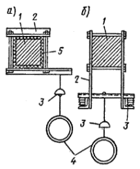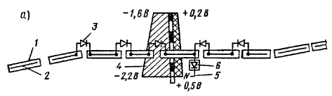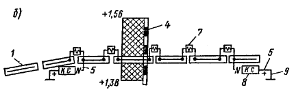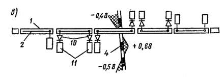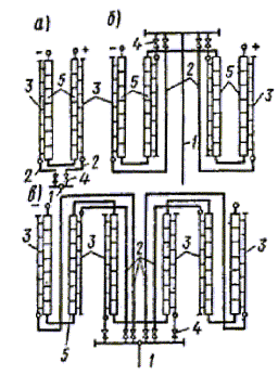 Рис. 5. Схема ввода электролитов в коллекторы электролизной установки, обладающая минимальными токами утечки а, б, в - схемы с двумя, четырьмя и шестью рядами электролизеров соответственно; 1 - труба ввода электролита в цех; 2 - труба ввода электролита в коллектор; 3 - рядовой коллектор электролита; 4 - вентиль; 5 - электролизеры Рис. 6. Схемы присоединения технологического оборудования к электролизной установке с уменьшенными токами утечки а - схема с двумя рядами электролизеров и общим сборным баком; б - схема с четырьмя рядами электролизеров и двумя сборными баками; в, г - схема с четырьмя рядами электролизеров и одним сборным баком; 1 - сборный бак электролита; 2 - отводящий трубопровод; 3 - рядовой коллектор с электролитом; 4 - электролизеры 13. Технологическое оборудование необходимо располагать в цехе и подключать к электролизной установке симметрично относительно середины электролизной установки. 14. Каждый ряд электролизеров должен иметь индивидуальные коллекторы или желоба, транспортирующие входящие электролиты и продукты электролиза. 15. Катодная, дренажная и протекторная защита оборудования электролизных установок может быть применена только после специальных проектных разработок и экспериментальных исследований, подтверждающих, что применение защиты уменьшает ток утечки через защищаемый участок и не приводит к резкому увеличению тока утечки на незащищенных участках. Отделения электролиза расплавов Напольные металлические решетки, находящиеся под потенциалом катода электролизера, должны быть электроизолированы от несущих строительных конструкций. В отделениях электролиза расплавов солей аммония допускается использовать в качестве электроизоляционных материалов: ацеид, асбокартон, асбест (в сухом состоянии). ПРИЛОЖЕНИЕ 11Схема электрозащиты блочной железобетонной конструкцииСхему электродренажной защиты (рис. 1, а) рекомендуется предусматривать для железобетонных конструкций, расположенных в знакопеременных зонах потенциалов электрифицированных рельсовых путей, в которых преобладают по величине и времени катодные значения потенциалов более 1 В. Схему катодной защиты (рис. 1, б) рекомендуется предусматривать для железобетонных конструкций, расположенных в анодных зонах потенциалов электрифицированных рельсовых путей. При этом в случае необходимости глухого соединения блочных конструкций между собой соединения должны выполняться в соответствии с рис. 2.