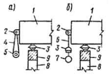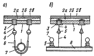 ПРИЛОЖЕНИЕ 10Требования к источникам блуждающих токов отделений электролизаОбщие указания 1. Выпрямители преобразовательных подстанций электролизных цехов на стороне постоянного тока должны быть надежно изолированы от земли и строительных конструкций. Сопротивление изоляции обеих шин выпрямителя относительно земли при отключенной электролизной установке должно быть не ниже 0,5 МОм. 2. При многорядовом расположении электролизных установок подключение их к выпрямителям рекомендуется выполнять так, чтобы соседние электролизные установки были обращены друг к другу участками одинаковой полярности. 3. Шины, технологические трубопроводы, желоба, как металлические, так и выполненные из неэлектропроводных материалов, должны быть изолированы от строительных конструкций воздушными зазорами не менее 50 мм, а от заземленного оборудования (баков, насосов и т.п.) и стоек под оборудование, не защищенных специальной оклеечной изоляцией, - зазорами не менее 200 мм. 4. Все проемы в местах пересечения шин и металлических трубопроводов с железобетонными конструкциями оборудуются гильзами и вставками из электроизоляционных материалов. 5. Для крепления трубопроводов и шин рекомендуется применять кронштейны из электроизоляционных материалов (например, армированного винипласта) (рис. 1) или металлические кронштейны и подвески с изоляцией в двух точках (рис. 2). Крепление кронштейнов к железобетонным конструкциям следует осуществлять с помощью обжимных хомутов, накладываемых на бетонную поверхность конструкции. Рис. 1. Примеры выполнения держателей из электроизоляционных материалов для крепления трубопроводов а - к балке; б - к колонне; 1 - железобетонная балка; 2 - железобетонная колонна; 3 - держатель из электроизоляционных материалов; 4 - трубопровод Рис. 2. Примеры выполнения металлических держателей для крепления трубопроводов а - с электроизоляционной вставкой в подвеске и в местах крепления хомута к железобетонной конструкции; б - с двумя электроизоляционными вставками в подвеске; 1 - железобетонная конструкция; 2 - металлический держатель; 3 - изолятор; 4 - трубопровод; 5 - изоляционная прокладка Крепления и подвески, пропускаемые через железобетонные конструкции, не рекомендуются. При вынужденном использовании таких креплений и подвесок места контакта с железобетонными конструкциями должны оборудоваться электроизоляционными вставками (рис. 3) или закладные детали креплений должны устанавливаться на полимерном клее. Рис. 3. Пример подвесок типа шпильки для крепления технологических трубопроводов а - одиночного; б - нескольких; 1 - железобетонная конструкция; 2 а, б, в - конструкция пола (а - бетонное основание пола; б - химически стойкая гидроизоляция, в - покрытие пола); 3 - диэлектрическая гильза; 4 - металлическая тяга; 5 - изолятор; 6 - изоляционная прокладка; 7 - трубопровод; 8 - поддерживающая конструкция Примечание. При выборе материала для кронштейнов следует учитывать теплостойкость материала. 6. Железобетонные конструкции не должны иметь контакта с подземными шпунтами или подземными металлическими контурами (грозозащитными, дренажными и др.). Отделения электролиза водных растворов 7. Для изоляции электролизеров, шин, трубопроводов и другого технологического оборудования рекомендуется применять подвесные и опорные изоляторы зонтичног