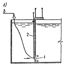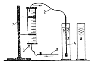 Черт. 8. Трубчатые аэраторы а, б - при смесителях вихревого типа; в, г - при смесителях перегородчатого типа; 1 - корпус смесителя; 2 - дырчатые ответвления для распределения воздуха; 3 - магистраль (коллектор) для подачи воздуха; 4 - подача коагулянта; 5 - подача воды Заданные скорости обеспечивают работу всех отверстий аэратора в струйно-барботажном режиме и достаточно эффективную работу аэратора. Неравномерность распределения воздуха по всей поверхности смесителя не превышает 15 - 20 %. 2.18. Для обеспечения эффективности аэрирования интенсивность аэрации следует принимать равной 70 - 80 м3/ (м2 ∙ ч). 2.19. В перегородчатых смесителях площадь сечения коллектора в аэраторе принимают в 3 раза более площади распределительных дырчатых труб. 2.20. Аэраторы можно изготавливать из металлических и неметаллических труб. В качестве металлических труб могут быть использованы обычные стальные трубы (Ст3) при ограниченном периоде (не более 2 - 3 мес.) коагулирования речных вод. При большем периоде коагулирования целесообразно применять коррозионно-стойкие трубы (полиэтиленовые). 2.21. Расчет подводящих воздухопроводов следует производить в соответствии с указаниями «Справочника проектировщика. Канализация населенных мест и промышленных предприятий» (М., Стройиздат, 1981). МЕТОДИКА ОПРЕДЕЛЕНИЯ ОПТИМАЛЬНОЙ ДОЗЫ КОАГУЛЯНТА И РАСХОДА ВОЗДУХА2.22. Предварительно следует определить дозу коагулянта без аэрирования в соответствии с общепринятыми методиками. Определение оптимального режима коагулирования с применением аэрирования надлежит производить с помощью прибора, схема которого приведена на черт. 9. Черт. 9. Прибор для аэрирования воды в цилиндрах 1 - мерный закрытый цилиндр; 2 - воздушная линия; 3 - лабораторные цилиндры; 4 - стеклянная трубка с резиновым наконечником; 5 - подача воды; 6 - патрубок для опорожнения цилиндра; 7 - штатив Мерный цилиндр вместимостью 500 мл изготовлен из оргстекла и установлен на штативе. По высоте цилиндр разделен на 20 равных частей. Объем каждой части составляет 5 % объема обрабатываемой воды в цилиндрах. При наполнении водой мерного цилиндра на одно деление такое же количество воздуха вытесняется в обрабатываемую воду. Воздух сверху из цилиндра отводится в стеклянную трубку с резиновым наконечником, которая используется одновременно для диспергирования пузырьков воздуха и перемешивания их со всем объемом обрабатываемой воды. Расход воздуха и время аэрации соответствуют объему и времени заполнения водой мерного цилиндра. 2.23. Методика пробной обработки воды коагулянтом с применением аэрирования заключается в следующем. Испытуемую воду наливают в ряд цилиндров вместимостью 500 мл. Дозы коагулянта в цилиндрах такие же, как и в опытах без аэрирования, с интервалом 10 мг/л. После добавления коагулянта производят перемешивание воды в цилиндрах в течение 8 - 10 с, затем осуществляют аэрирование. Расход воздуха варьируют в пределах 10 - 40 % объема воды с интервалом 5 %. Вначале во все цилиндры вводят 10 % воздуха, затем 15 % и т.д. Примерный диапазон и изменение расхода воздуха можно принимать по табл. 6. Продолжительность аэрирования составляет 6 - 8 с. После аэрирования производят быстрое смешение содержимого в цилиндрах палочкой с резиновым наконечником в течение 5 с, а затем - медленное, как в опыте без аэрирования. В цилиндрах воду отстаивают в те