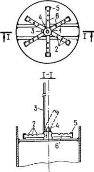 Черт. 1. Схема установки перфорированного распределителя коагулянта (тип I) а - в вихревом смесителе; б - в перегородчатом или коридорном смесителе, входной камере контактного осветлителя; 1 - распределитель; 2 - секционная свинчивающаяся штанга; 3 - подача коагулянта; 4 - зарядка сифона 1.2. Потери напора при обтекании распределителя водой составляют 10 - 15 см. 1.3. Распределители из перфорированных трубок не рекомендуется применять при обработке воды раствором коагулянта, содержащим нерастворимые примеси. 1.4. Для введения растворов минеральных коагулянтов следует применять распределители из винипластовых труб или из нержавеющей стали. 1.5. Распределитель коагулянта (черт. 2) состоит из центрального бачка со штуцером, на который надевается шланг для подачи коагулянта, и радиальных перфорированных трубок-лучей, имеющих отверстия, направленные по движению потока воды. Распределитель опускается на место установки с помощью свинчивающейся из отдельных секций штанги. Черт. 2. Перфорированный распределитель коагулянта (тип I) 1 - центральный бачок; 2 - отверстия для ввода коагулянта; 3 - разъемная штанга; 4 - штуцер для присоединения шланга подачи коагулянта; 5 - заглушка; 6 - перфорированная трубка-луч 1.6. Число отверстий в распределителе следует определять по расходу раствора коагулянта и величине потери напора в распределителе 30 - 50 см. 1.7. Расход раствора коагулянта qк, см3/с, следует определять по формуле