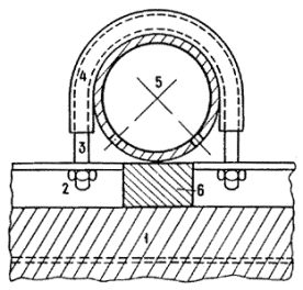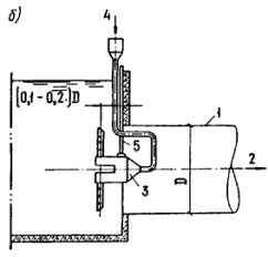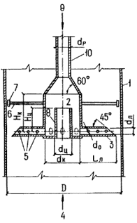 Черт. 4. Схемы установки камерно-лучевых распределителей (тип II) а - вблизи выходного сечения вертикального трубопровода; б - вблизи входного сечения горизонтального отводящего трубопровода; 1 - трубопровод; 2 - движение воды; 3 - камерно-лучевой распределитель; 4 - подача реагента; 5 - опорная конструкция 1.18. Расчетные показатели камерно-лучевых распределителей и размеры их конструктивных элементов приведены в табл. 4. Таблица 4
