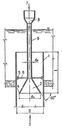ДИФФУЗОРНЫЙ РАСПРЕДЕЛИТЕЛЬ (ТИП III)1.19. Диффузорные распределители предназначены для смешения обрабатываемой воды с жидкими реагентами, в особенности с теми, которые содержат значительное количество твердых примесей (известковым молоком, угольной суспензией). 1.20. Диффузорный распределитель устанавливают в вертикальных трубопроводах по оси потока обрабатываемой воды. Он состоит из конического диффузора, обращенного выходным сечением навстречу потоку, и реагентопровода, присоединенного к входному сечению диффузора и снабженного приемником реагента. Горизонтальные кромки выходного сечения диффузора образуют со стенками трубопровода рабочий зазор для пропуска потока обрабатываемой воды (черт. 5). Черт. 5. Диффузорный распределитель (тип III) 1 - корпус трубопровода; 2 - диффузор; 3 - движение воды; 4 - рабочий зазор; 5 - глухая резиновая муфта; 6 - радиальная распорка; 7 - подача реагента; 8 - приемник реагента; 9 - реагентопровод 1.21. Быстрое распределение реагентов обеспечивается за счет: поступления части исходной воды в диффузор под действием скоростного напора, имеющего наибольшую величину в ядре потока; рециркуляции воды внутри диффузора в результате гашения скоростного напора и смешения ее с реагентом, поступающим в диффузор через реагентопровод; равномерного распределения разбавленного реагента в рабочем зазоре; турбулентной диффузии, образующейся в результате расширения потока при выходе из рабочего зазора. Поступление разбавленного реагента из диффузора в рабочий зазор происходит за счет подсоса в область минимальных давлений. 1.22. Диффузорный распределитель следует размещать в трубопроводе свободно и центрировать радиальными распорками с зазорами между их торцами и стенкой трубопровода, равными 5 - 10 мм. Допускается блокировка с камерно-лучевым распределителем (черт. 6). 1.23. Диффузорный распределитель можно одновременно с основным назначением использовать в качестве сужающего устройства для измерения расхода обрабатываемой воды с коэффициентом гидравлического сопротивления, указанным в табл. 5.