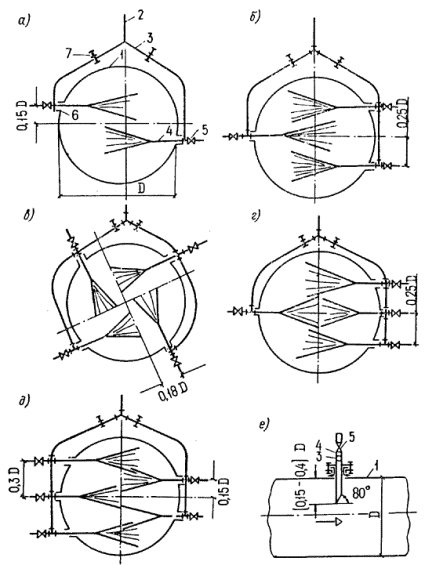 СТРУЙНЫЙ РАСПРЕДЕЛИТЕЛЬ СУСПЕНЗИЙ РЕАГЕНТОВ (ТИП IV)1.25. Распределители струйного типа предназначены для быстрого смешения суспензий реагентов (извести, угля, глины и др.) с водой в напорных трубопроводах диаметром 200 - 1400 мм. Распределители надлежит выполнять по одной из приведенных на черт. 7 схем, включающих: два распределительных элемента для трубопроводов диаметром D = 200 - 400 мм (вариант а); три - для D = 500 - 700 мм (вариант б); четыре - для D = 800 - 1000 мм (варианты в, г); пять - для D = 1200 - 1400 мм (вариант д). 1.26. Распределители можно устанавливать как на горизонтальных, так и на вертикальных участках трубопроводов. В месте установки распределителя расстояние от поверхности трубопровода до ограждающих конструкций должно быть не менее 300 мм. 1.27. Каждый распределительный элемент распределителя суспензии следует выполнять в виде трубки, введенной срезанным концом в трубопровод через сальниковое устройство и установленной срезом по направлению потока. На противоположном конце трубки снаружи трубопровода устанавливают запорную арматуру или струбцину на резинотканевом рукаве. 1.28. Быстрое смешение обеспечивается струйной подачей суспензии реагента через несколько распределительных элементов перпендикулярно потоку воды с охватом большей части поперечного сечения потока струями реагента. Для повышения эффективности смешения предусмотрена возможность увеличения длины распространения струй за счет выполнения среза трубки под углом 80°. Продольное перемещение распределительного элемента в сальнике позволяет добиться наибольшей площади охвата поперечного сечения потока воды струей реагента. При скорости выхода струи из распределительного элемента менее средней скорости движения воды в трубопроводе длину введенного в трубопровод участка распределительного элемента следует увеличивать, при большей скорости выхода реагента - уменьшать. 1.29. Диаметр выпускного отверстия распределительного элемента следует принимать равным 8 - 15 мм. При этом следует предусматривать возможность и устройство для очистки от внутренних отложений путем последовательного отключения одной из ветвей распределительного коллектора и применения пробойников соответствующего диаметра (6 - 12 мм). Черт. 7. Струйные распределители суспензий реагентов (тип IV) а - д - варианты схем: а - D = 200 - 400 мм; б - D = 500 - 700 мм; в, г - D = 800 - 1000 мм; д - D = 1200 - 1400 мм; е - деталь ввода суспензии; 1 - трубопровод; 2 - реагентопровод; 3 - коллектор распределительный (резинотканевый рукав); 4 - стальная трубка; 5 - арматура запорная; 6 - сальник; 7 - струбцина запорная 2. АЭРИРОВАНИЕ КАК СРЕДСТВО ИНТЕНСИФИКАЦИИ ПРОЦЕССА КОАГУЛЯЦИИ ПРИРОДНЫХ ВОД11 Следует применять в экспериментальном порядке. СУЩНОСТЬ МЕТОДА И ОБЛАСТЬ ПРИМЕНЕНИЯ2.1. При обработке природных вод в процессе гидролиза коагулянта образуется значительное количество свободной углекислоты, содержащейся главным образом в газовой фазе вследствие ее малой растворимости. На начальной стадии коагуляции взвешенных веществ при развитой поверхности твердой и газовой фаз происходит интенсивная адсорбция мельчайших пузырьков углекислоты на поверхность микрохлопьев коагулированной взвеси. В результате образуется осадок непрочной, рыхлой структуры. 2.2. Своевременное удаление углекислоты из сферы образования микрохлопьев, достигаемое за счет аэрации во