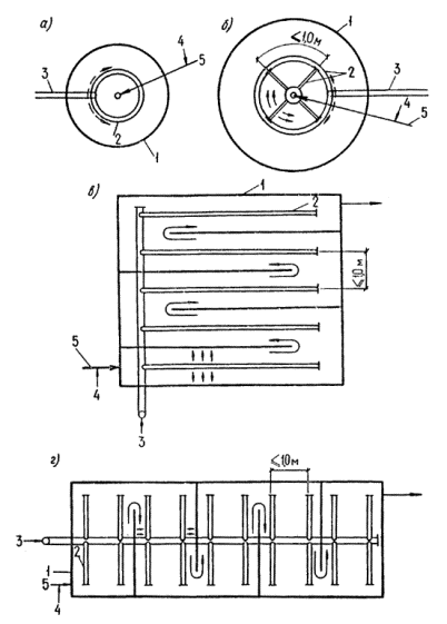 Примечание. При обработке цветных вод расход воздуха нужно принимать, %, при цветности воды, град: до 40 10 св. 40 до 60 15 « 60 « 80 20 2.7. Аэрирование воды допускается осуществлять в открытых смесителях гидравлического типа (вихревых и перегородчатых), дополнительных сооружений не требуется. 2.8. Метод обработки воды с аэрированием требует строгой последовательности ввода коагулянта и сжатого воздуха. Введение диспергированного воздуха в период гидролиза коагулянта и образования микрохлопьев обеспечивает наибольший эффект аэрирования. 2.9. Интервал между вводом коагулянта и воздуха следует принимать 10 - 20 с - время, необходимое для смешения коагулянта с водой и начала его гидролиза. Верхний предел относится к тем случаям, когда процесс смешения замедляется вследствие низкой температуры воды. Оптимальный интервал определяется пробной обработкой воды. 2.10. Раствор коагулянта следует вводить в подающий трубопровод или при входе воды в смеситель, а диспергированный воздух - непосредственно в смеситель. Время аэрирования равно времени пребывания воды в смесителе. 2.11. Необходимость предварительного хлорирования или подщелачивания, а также применения других реагентов и последовательность их ввода устанавливаются при пробной обработке речной воды. 2.12. Аэраторы в смесителях располагают на глубине не менее 3 м от поверхности воды. Во избежание подсоса воздуха в трубопровод, отводящий воду из смесителя, водосборные лотки должны работать с подтоплением (открытый перелив исключается); над трубопроводом необходимо предусматривать отражательный щит. Наилучшим вариантом является применение водосборных лотков с затопленными окнами. Устройство самостоятельного воздухоотделителя после смесителя-аэратора не требуется. 2.13. Распределение воздуха в смесителях может быть осуществлено с помощью фильтросных устройств или перфорированных труб. Фильтросы позволяют получить более мелкое дробление пузырьков, при котором расход воздуха для аэрации воды снижается. Однако сопротивление фильтросов значительно выше, и они быстро загрязняются, что влечет за собой частую промывку их и перерасход электроэнергии, поэтому в Пособии рассматриваются только аэраторы из перфорированных труб. 2.14. Для подачи воздуха в трубчатые аэраторы могут быть использованы воздуходувные агрегаты, применяемые на водоочистных станциях для приготовления раствора коагулянта и других нужд реагентного хозяйства. Подающий трубопровод следует присоединять к аэратору сверху и оборудовать расходомером. 2.15. Схема трубчатого аэратора зависит от конструкции смесителя и условий его эксплуатации. Для обеспечения равномерности распределения воздуха дырчатые трубы аэратора нужно располагать строго горизонтально. На черт. 8 приведены различные схемы трубчатых аэраторов в вихревых и перегородчатых смесителях. На схеме а представлен кольцевой трубчатый аэратор, который следует применять для смесителей вихревого типа. При больших размерах сечения смесителя (в плане) целесообразно кольцевую трубу дополнить радиальными трубами, как показано на схеме б. Схемы в и г применяют при устройстве аэраторов в перегородчатых смесителях. Аэратор в перегородчатых смесителях надлежит выполнять в виде коллектора с ответвлениями. Расстояние между ответвлениями следует принимать не более 0