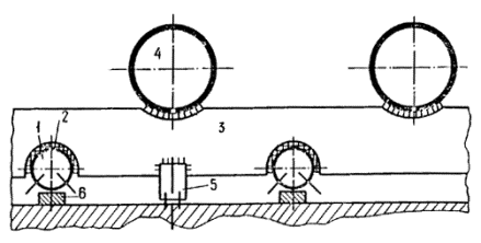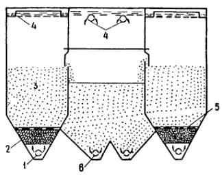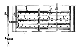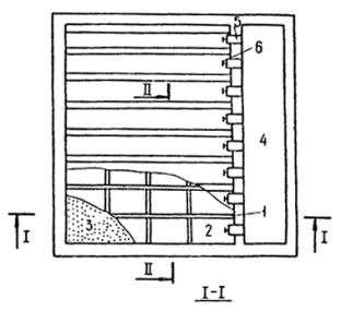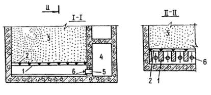 Принимаем удельную нагрузку равной 6 м/ч и длину тонкослойных элементов 1,0 м. 5. НАПОРНАЯ ГИДРАВЛИЧЕСКАЯ СИСТЕМА СМЫВА ОСАДКА В ГОРИЗОНТАЛЬНЫХ ОТСТОЙНИКАХНАЗНАЧЕНИЕ И ОБЛАСТЬ ПРИМЕНЕНИЯ5.1. Система предназначена для удаления осадка из горизонтальных отстойников открытого и закрытого типов после отключения отстойников с помощью напорных струй воды без применения ручного труда. 5.2. Гидросмыв наиболее целесообразно применять при наличии малоподвижных осадков, образующихся в условиях очистки мутных вод и характеризующихся содержанием взвеси не более 1500 мг/л. 5.3. Высота слоя осадка в отстойнике должна быть не более 1 - 1,5 м. УСТРОЙСТВО И ПРИНЦИП РАБОТЫ СИСТЕМЫ5.4. Система (черт. 17) включает в себя устройства для подачи воды и отвода размытого осадка. Подача воды производится с помощью насоса, коллекторов, разводящих труб и специальных насадок. Отвод воды с осадком осуществляется с помощью лотков, устроенных в днище отстойника, и далее по трубам в приемный резервуар сооружений по обработке промывных вод и осадков. Черт. 17. Система гидравлического смыва осадка в горизонтальных отстойниках 1 - насос для подачи воды; 2 - подводящие трубы; 3 - коллектор; 4 - разводящие трубы; 5 - патрубки с насадками; 6 - лотки 5.5. Для смыва осадка надлежит использовать сырую воду или воду из верхней части отстойника, сбрасываемую перед его очисткой в специальный запасной резервуар. 5.6. Управление системой осуществляют с помощью задвижек, установленных на напорном и всасывающем трубопроводах насоса. Перед пуском системы в работу закрывают задвижку на трубопроводе, подающем обрабатываемую воду в отстойник, открывают задвижку на канализационном трубопроводе и производят опорожнение отстойника примерно на 2/3 его высоты. Затем открывают задвижку на напорном трубопроводе, подающем воду в систему удаления осадка, и включают насос. При этом осадок, накопившийся в отстойнике, взмучивается, происходят его смыв и удаление одновременно с опорожнением отстойника. Выключение системы производят через 3 - 5 мин после полного опорожнения отстойника. Ориентировочно время удаления осадка составляет 30 - 40 мин. 5.7. Коллектор напорной системы следует размещать при длине отстойника, м: 40 - 45 - в начале разводящих труб; 60 - в средней его части с симметричным (по отношению к коллектору) расположением разводящих труб; 90 - в средней части отстойника надлежит устраивать два коллектора, при этом отстойник делится на две симметричные секции и в каждый коллектор подается вода от насоса по отдельной трубе. 5.8. Разводящие трубы следует укладывать по дну отстойника. При ширине отстойника до 4,5 м необходимы две нитки труб, прокладываемых вдоль стен отстойника. Лоток для сбора осадка и промывной воды размещают в этом случае по оси отстойника. При ширине отстойника, равной 6 м, устанавливают три ряда разводящих труб, один из которых размещают по оси отстойника (в этом случае в отстойнике устраивают два отводящих лотка посредине между разводящими трубами). 5.9. Разводящие стальные трубы следует выполнять с переменным (телескопическим) сечением, что увеличивает равномерность распределения воды и позволяет снизить расход металла. Переход с одного диаметра труб на другой надлежит предусматривать посредине длины участка. Для предотвращения заиления пространство под трубами заливают бетоном (марки 