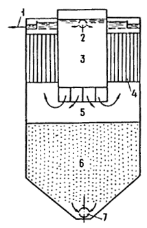 Черт. 12. Осветлитель с контактной камерой хлопьеобразования 1 - подача исходной воды; 2 - контактная камера хлопьеобразования; 3 - зона взвешенного осадка; 4 - отвод осветленной воды; 5 - решетка; 6 - удаление осадка 4. ОТСТОЙНИКИ И ОСВЕТЛИТЕЛИ, ОБОРУДОВАННЫЕ ТОНКОСЛОЙНЫМИ ЭЛЕМЕНТАМИНАЗНАЧЕНИЕ И ОБЛАСТЬ ПРИМЕНЕНИЯ4.1. Отстойные сооружения (вертикальные и горизонтальные отстойники и осветлители со взвешенным осадком), оборудованные тонкослойными элементами, предназначены для осветления природных поверхностных вод малой и средней мутности и цветности на водоочистных станциях систем хозяйственно-питьевого и промышленного водоснабжения. 4.2. В сооружениях тонкослойного осветления осаждение взвеси происходит в наклонных элементах малой высоты. При этом обеспечиваются быстрое выделение взвеси и ее сползание по наклонной плоскости элементов в зоны хлопьеобразования и осадкоуплотнения. 4.3. Тонкослойные отстойные сооружения можно применять как при реконструкции действующих отстойников и осветлителей с целью их интенсификации, так и для вновь проектируемых водоочистных станций. 4.4. Рекомендации настоящего Пособия распространяются на сооружения с противоточным движением воды и осадка в тонкослойных элементах. 4.5. Требования к качеству и методам обработки воды, поступающей на сооружения с тонкослойными элементами, аналогичны требованиям для других типов отстойных сооружений. Производительность тонкослойных отстойников и осветлителей не ограничивается. ТЕХНОЛОГИЧЕСКИЕ СХЕМЫ И КОНСТРУКТИВНЫЕ ОСОБЕННОСТИ ТОНКОСЛОЙНЫХ ОТСТОЙНЫХ СООРУЖЕНИЙ4.6. Тонкослойный вертикальный отстойник (черт. 13) работает следующим образом. Исходная вода, обработанная реагентами, поступает в расположенную в центральной части отстойника камеру хлопьеобразования и затем, после ее прохождения, вместе с образующимися хлопьями проходит последовательно распределительную зону и тонкослойные наклонные элементы. Осветленная вода через сборные желоба отводится из сооружения. Осадок из отстойника сбрасывается через систему удаления осадка. Черт. 13. Вертикальный отстойник, оборудованный тонкослойными блоками 1 - отвод отстоенной воды; 2 - подача исходной воды; 3 - камера хлопьеобразования; 4 - тонкослойные блоки; 5 - зона распределения воды; 6 - зона накопления осадка; 7 - удаление осадка 4.7. В тонкослойном горизонтальном отстойнике (черт. 14) обработанная реагентами исходная вода поступает во встроенную камеру хлопьеобразования (любого из рекомендуемых действующими нормами типов). Из камеры поток воды, двигаясь горизонтально под блоками и поднимаясь снизу вверх, проходит тонкослойные элементы и поступает в расположенную над ними сборную систему и карман. Накапливающийся в отстойнике осадок периодически сбрасывается через систему удаления осадка. 4.8. Тонкослойный осветлитель (черт. 15) работает следующим образом. Исходная вода, обработанная реагентами, поступает в зоны предварительного хлопьеобразования (взвешенного осадка) и далее через распределительную зону и зону сползающего осадка поступает в тонкослойные элементы. Осветленная вода, пройдя тонкослойные элементы, поступает в сборные устройства и отводится из сооружения. Осадок из зоны его накопления удаляется через перфорированные трубы.