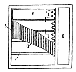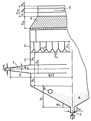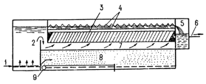 где Q - расход воды, подаваемой плавучим водозабором-осветлителем, м3/с; nж - число желобов; vж - скорость движения воды на выходе из желобов, равная 0,5 - 0,6 м/с. Для водозаборов малой производительности (до 10 - 15 тыс. м3/сут) сбор осветленной воды может осуществляться периферийными или радиальными желобами. Для равномерного сбора воды желобами расстояние между верхом тонкослойных элементов и низом треугольных вырезов водосливов в желобах должно быть равным 35 - 50 см. 10.13. Разность отметок уровней воды в водоисточнике и в сборном кармане составляет 5 - 10 см. 10.14. Конструкция понтона плавучего водозабора-отстойника должна обеспечивать устойчивость сооружения. При расчете понтона следует учитывать гидроморфологический режим потока, волновые колебания и т.п. ТОНКОСЛОЙНЫЙ ОСВЕТЛИТЕЛЬ СИСТЕМЫ АзНИИВП-210.15. Тонкослойный осветлитель системы АзНИИВП-2 (черт. 35) представляет собой прямоугольный или круглый в плане резервуар с боковым подводящим патрубком-диффузором, зоной хлопьеобразования, зоной осветления, содержащей пакеты плоских наклонных параллельных пластин или трубчатых элементов, установленных под углом 45 - 60° к горизонтали, желобами для рассредоточенного отвода осветленной воды. В зоне хлопьеобразования установлена решетка из стандартных уголков с вертикальными направляющими пластинками, перпендикулярными оси входного потока. Уголковые элементы расположены на равном расстоянии один от другого по всему сечению зоны. Для сбора осадка предназначена осадочная часть резервуара, из которой осадок отводят в водосток или систему обработки осадка. Осадочная часть оборудуется напорным трубопроводом с наклонными насадками для непрерывного или периодического размыва шлама в осадочной части осветлителя. Особенность диффузорного подвода воды состоит в том, что часть взвеси из поступающей воды сразу выпадает в осадок и лишь оставшаяся взвесь выделяется в зоне осветления. Благодаря этому сооружение может работать при больших грязевых нагрузках. 10.16. Площадь осветлителя следует определять исходя из удельной нагрузки 8 - 12 м3/ч на 1 м2 рабочей площади. 10.17. Общая высота осветлителя является суммой высот отдельных элементов, показанных на черт. 35. Обычно она равна 5 - 6 м. 10.18. Нижняя часть осветлителя имеет наклонные стенки под углом до 45° к горизонтали. Для осветлителей площадью свыше 20 м2 целесообразно предусматривать угол наклона стенок 15 - 20°, но при этом следует проектировать напорную систему гидравлического смыва осадка. 10.19. Высота конической части H1, м, определяется по формуле Н1 = tg aк (В - d1), (43) где aк - угол наклона стенки к горизонтальной плоскости, град; В - ширина осветлителя, м; d1 - диаметр сбросной трубы, м. Высота от конической части до оси диффузора H2, м, равна: Н2 ³ 0,5 tg aд В + где aд - угол раскрытия диффузора, равный 8 - 14°; D0 - диаметр выходного участка диффузора, м. Черт. 35. Тонкослойный осветлитель системы АзНИИВП-2 1 - диффузор для подвода обрабатываемой воды; 2 - корпус; 3 - уголковая решетка; 4 - тонкослойные элементы; 5 - желоб для сбора осветленной воды; 6 - осадочная часть; 7 - патрубок для отвода осадка; 8 - трубчатая напорная система для гидросмыва осадка 10.20. Диаметр подводящего