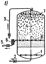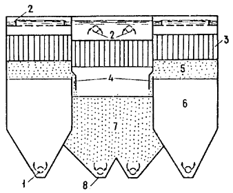 Черт. 30. Фильтры с плавающей пенополистирольной загрузкой а - ФПЗ-1; б - ФПЗ-4; в - ФПЗ-4н (ФПЗ-3,4-150); 1 - нижняя сборно-распределительная система; 2 - отвод промывной воды; 3 - подача исходной воды; 4 - пенополистирольная загрузка; 5 - отвод фильтрата; 6 - уловитель пенополистирола; 7 - верхняя распределительная система; 8 - средний дренаж 9.13. В фильтрах ФПЗ-4 и ФПЗ-4н с нисходящим фильтрационным потоком (черт. 30, б, в) используется более неоднородная загрузка. Исходная вода фильтруется в направлении убывающей крупности гранул и собирается средней дренажной системой, расположенной в толще загрузки с гранулами диаметром 0,8 - 1,5 мм. 9.14. Когда потери напора на фильтре достигнут заданной величины (1,5 - 2,0 м в безнапорных фильтрах и 6 - 10 м - в напорных), задвижку на трубопроводе подачи исходной воды закрывают, а задвижку на трубопроводе отвода промывной воды открывают. Промывка загрузки происходит так же, как в фильтрах ФПЗ-1 (исходной водой). При концентрации взвеси в исходной воде свыше 150 мг/л рекомендуется после сбрасывания уровня воды в надфильтровом пространстве на 0,5 м подавать в него отфильтрованную воду в количестве, необходимом для промывки загрузки чистой водой в течение 2 мин. 9.15. В напорных фильтрах ФПЗ-4н, имеющих заводскую марку ФПЗ-3,4-150 (см. черт. 30, в), подача исходной воды и ее распределение по площади фильтра осуществляются с помощью дырчатых труб с отверстиями диаметром 10 мм, перекрытых сеткой с ячейками размером 0,5 мм. 9.16. Для промывки средних дренажных систем предусмотрены патрубки, смонтированные после задвижки на трубопроводе отвода фильтрата. 9.17. Нижние системы фильтров ФПЗ-1 и ФПЗ-4 изготовляют из асбестоцементных дырчатых труб. 9.18. Верхние системы безнапорных фильтров изготовляют в виде перекрытия из полутруб или бетонных балок, уложенных с зазорами между ними, равными 5 мм, присыпанных слоем отмытого гравия диаметром зерен 25 - 40 мм на толщину до 0,2 м. РАСЧЕТ И КОНСТРУИРОВАНИЕ ФИЛЬТРОВ9.19. Основные параметры работы фильтров типа ФПЗ для технического водоснабжения приведены в табл. 13. Таблица 13