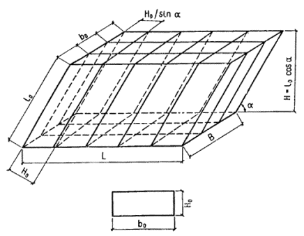 Черт. 16. Конструктивные параметры тонкослойных элементов в блоке l0 - длина тонкослойного элемента; b0 - ширина тонкослойного элемента; H0 - высота тонкослойного элемента; Н - высота тонкослойного сотоблока; L - длина тонкослойного сотоблока; В - ширина тонкослойного сотоблока 4.11. Установку отдельных блоков в отстойниках и осветлителях следует осуществлять с помощью специальных несущих конструкций, расположенных под или над ними, либо их креплением к элементам сборной системы (желобам, лоткам, трубам) и промежуточным стенкам сооружений. При этом могут быть использованы стальные или полимерные трубы, дерево, арматурная проволока, профилированные конструкции и т.д. 4.12. Необходимо обеспечивать герметичность зазоров между отдельными блоками и внутренними стенками сооружений, например, с помощью резиновых прокладок. 4.13. Сбор осветленной воды из тонкослойных сооружений следует осуществлять по желобам с затопленными отверстиями или открытыми водосливами, например, треугольного профиля, расположенными на расстоянии не более 2 м один от другого. РАСЧЕТ ТОНКОСЛОЙНЫХ ОТСТОЙНИКОВ И ОСВЕТЛИТЕЛЕЙ4.14. Расчет технологических и конструктивных параметров сооружений, а также отдельных тонкослойных элементов следует производить по зависимости Для удобства расчета формула (5) приведена к виду К2 = j - коэффициент, учитывающий влияние гидродинамических условий потока в тонкослойных элементах (см. п. 4.16); Кф - коэффициент, учитывающий форму поперечного сечения тонкослойных элементов (см. п. 4.19); Н0 - высота тонкослойного элемента, м; v0 - средняя скорость потока в тонкослойных элементах, м/ч; u0 - расчетная скорость осаждения взвеси, м/ч; a - угол наклона тонкослойных элементов к горизонту, град; b - коэффициент, учитывающий стесненное осаждение взвеси под тонкослойными элементами; Каг - коэффициент агломерации, учитывающий влияние осадка, выделяющегося из тонкослойных элементов, на интенсификацию хлопьеобразования (см. п. 4.17); Кст - коэффициент, учитывающий стеснение сечения потока в тонкослойном элементе сползающим осадком (см. п. 4.17); Vн - удельная нагрузка или производительность сооружения в расчете на площадь зеркала воды, м3/ (м2 × ч) или м/ч; К1, К2 - обобщенные расчетные коэффициенты [см. формулы (8) и (9)]; l0 - длина тонкослойного элемента, м; Ко.и - коэффициент, учитывающий гидравлическое совершенство тонкослойного сооружения и степень его объемного использования - отношение фактического к расчетному времени пребывания воды (см. п. 4.20); Кк - конструктивный коэффициент, равный отношению фактической открытой для движения воды площади тонкослойных элементов к общей площади зеркала воды отстойного сооружения (см. п. 4.21). 4.15. Расчетная скорость осаждения взвеси должна приниматься в соответствии с опытом эксплуатации сооружений, работающих в аналогичных условиях. При отсутствии такого опыта следует производить технологическое моделирование процессов хлопьеобразования и тонкослойного осаждения с целью определения требуемого значения u0. При невозможности указанного значение u0 определяют по данным СНиП 2.04.02-84. 4.16. Коэффициент j следует определять по данным табл. 7, в которой b0 - ширина тонкослойного элемента, Н0 - высота тонкослойного элемента. Таблица 7