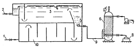 Примечания: 1. В гр. 6 и 7 над чертой указаны диаметры телескопических напорных труб на начальном, под чертой - на конечном участках. 2. В гр. 8 над чертой первая цифра - число боковых труб, вторая - число насадок на них, под чертой первая цифра - число центральных труб, вторая - число насадок на них. 3. Основные параметры системы указаны ориентировочно. В каждом конкретном случае следует производить расчет системы и выбор насосов исходя из местных условий. 5.19. Расчетные параметры системы гидравлического удаления осадка в зависимости от размеров наиболее часто применяемых отстойников приведены в табл. 8. 5.20. Система удаления воды и осадка должна быть рассчитана на пропуск воды, сбрасываемой из отстойника и подаваемой насосами. 6. ФЛОТАЦИОННЫЕ СООРУЖЕНИЯНАЗНАЧЕНИЕ И ОБЛАСТЬ ПРИМЕНЕНИЯ6.1. Флотационные сооружения надлежит применять для предварительного осветления и обесцвечивания природной водой перед подачей ее на фильтры. Они могут быть использованы как при новом строительстве, так и при реконструкции существующих водоочистных станций. 6.2. Наиболее эффективная область применения флотационных сооружений - осветление вод поверхностных источников (озер, водохранилищ, рек и т.п.) с небольшим количеством мелкодисперсных взвешенных веществ (не более 150 мг/л) и повышенной цветностью (до 200 град) при содержании фитопланктона и плавающих нефтепродуктов. 6.3. Возможность и целесообразность использования флотационного осветления воды в каждом конкретном случае должны быть обоснованы технологическими испытаниями, произведенными в характерные периоды года по методике, приведенной в пп. 6.16 - 6.20. Количество взвешенных веществ в воде после флотационных сооружений не должно превышать 10 мг/л. 6.4. Преимущества флотационных сооружений по сравнению с другими сооружениями предварительного осветления (осветлителями со взвешенным осадком, отстойниками) заключаются в следующем: значительно ускоряется процесс выделения взвеси из воды, благодаря чему уменьшается общий объем очистных сооружений; улучшается их санитарное состояние вследствие постоянного удаления выделенных загрязнений; более эффективно удаляется фитопланктон, что в большинстве случаев позволяет отказаться от установки микрофильтров; удаляются из воды плавающие и плохооседающие примеси. СОСТАВ СООРУЖЕНИЙ, ИХ УСТРОЙСТВО И РАСЧЕТНО-КОНСТРУКТИВНЫЕ ПАРАМЕТРЫ6.5. Очистные сооружения с флотационным осветлением воды имеют тот же состав основных и вспомогательных сооружений, что и обычные станции двухступенчатого осветления, за исключением отстойников или осветлителей со взвешенным слоем осадка, заменяемых флотационными установками. 6.6. В составе флотационных сооружений необходимо предусматривать флотационные камеры, узел подготовки и распределения водовоздушного раствора, устройства для удаления и отвода флотационной пены. Перед осветлением воды флотацией надлежит предусматривать камеры хлопьеобразования, совмещенные с флотационными камерами. Схема флотационных сооружений представлена на черт. 18. Черт. 18. Флотационная установка 1 - подача исходной воды с реагентами; 2 - отвод осветленной воды; 3 - флотационная камера; 4 - лотки для сбора пены; 5 - распределительная система; 6 - напорный бак; 7 - насос; 8 - компрессор; 9 - подача воды, насыщенной воздухом; 10 - камера хлопьеобразования 6.7. 