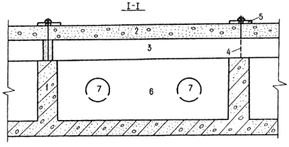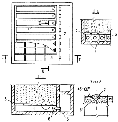 Черт. 26. Дренаж из полимербетонных плит 1 - опорные стенки; 2 - сборный канал; 3 - полимербетонные плиты; 4 - фильтрующая загрузка; 5 - патрубки; 6 - отражатели; 7 - стыки плит (а - 20 - 30 мм) 8.9. Дренаж из монолитного полимербетона (черт. 29) представляет собой сплошную полимербетонную плиту, изготовляемую непосредственно в фильтре. Дренаж состоит из следующих основных частей: опорной системы, включающей вертикальные стенки и уложенные на них горизонтально железобетонные колосники; пористого слоя из полимербетона; деталей крепления, включающих анкерную арматуру и удерживающие пластины. 8.10. При водовоздушной промывке на дне фильтра крепят дырчатые воздухораспределительные трубы. Общий трубопровод подачи воздуха следует располагать выше воздухораспределительных труб.