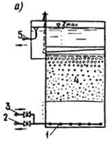 сероводорода не более 3 мг/л; рН - не менее 6,5; щелочность свыше 1 + 11.4. Применение настоящей технологии целесообразно главным образом для небольших установок производительностью до 2 - 3 тыс. м3/сут, большей производительностью - при наличии технико-экономических обоснований. 11.5. Особенностями метода являются высокая грязеемкость фильтрующей загрузки и отсутствие обратной промывки, а также возможность использования для загрузки различных материалов. При этом продолжительность фильтроцикла составляет несколько месяцев и зависит от содержания железа в исходной воде, скорости фильтрования и параметров загрузки. В качестве фильтрующей загрузки могут использоваться кварцевый песок, дробленый керамзит, кирпич, антрацит, гравий и др. В хозяйственно-питьевом водоснабжении на применяемую фильтрующую загрузку необходимо иметь разрешение Минздрава союзной республики. Время зарядки фильтрующей загрузки незначительно и составляет 1 - 10 ч, после чего обеспечивается стабильная работа установки в течение всего фильтроцикла. ТЕХНОЛОГИЧЕСКАЯ СХЕМА И СОСТАВ СООРУЖЕНИЙ11.6. В состав установки входят напорные фильтры, компрессоры или воздуходувные агрегаты, а также необходимые подсобно-вспомогательные помещения в соответствии с действующими нормативами. 11.7. Процесс обезжелезивания осуществляется по следующей схеме (см. черт. 36): исходная вода от скважин подается в смеситель с разбрызгивателем, находящийся в верхней части напорного фильтра, туда же подается сжатый воздух от компрессоров или воздуходувные агрегаты; в смесителе вода перемешивается с воздухом, равномерно распределяясь по поверхности фильтрующей загрузки, затем фильтруется. После фильтрования вода отводится к потребителям, а воздух сбрасывается в атмосферу. Черт. 36. Принципиальная схема обезжелезивания воды методом водовоздушного фильтрования 1 - скважина; 2 - сброс воздуха; 3 - напорный фильтр; 4 - компрессор; 5 - подача воды потребителю РАСЧЕТНЫЕ ПАРАМЕТРЫ СООРУЖЕНИЙ И ИХ КОНСТРУКТИВНЫЕ ОСОБЕННОСТИ11.8. Площадь фильтров F, м2, определяют по формуле