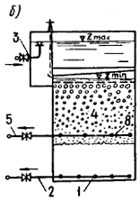 КОНСТРУКЦИИ И ПРИНЦИП РАБОТЫ ФИЛЬТРОВ9.10. Для технического водоснабжения рекомендуются фильтры ФПЗ-1 и ФПЗ-4, область применения которых указана в табл. 13. 9.11. В фильтре с восходящим фильтрационным потоком ФПЗ-1 (черт. 30, а) исходная вода фильтруется снизу вверх через удерживаемую в затопленном состоянии верхней системой пенополистирольную загрузку, собирается в надфильтровом пространстве и отводится в резервуар чистой воды. 9.12. Промывка пенополистирольной загрузки осуществляется нисходящим потоком чистой воды, накопленной в надфильтровом пространстве. Загрузка при этом расширяется на 20 - 30 %, а накопленные в ней загрязнения уносятся в канализацию.