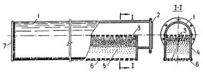 где Wпр - интенсивность промывки, л/ (с × м2); f0 - площадь одной секции фильтра, м2; m - коэффициент расхода в отверстиях, принимаемый равным 0,6; h1 - напор воды над осью коллектора в начале промывки, м; Nc - число секций фильтров; tпр - продолжительность промывки, мин; h2 - напор воды над осью коллектора в конце промывки с учетом потерь напора в загрузке и нижней сборной системе, м. 9.27. Длину дырчатых труб ответвлений lт назначают конструктивно в зависимости от места расположения сборного коллектора, его диаметра, способа присоединения к нему труб и размеров фильтра в плане. Число труб принимают, исходя из максимального расстояния между ними в плане, равного 0,5 м. 9.28. Диаметр дырчатых труб определяют по удельному промывному расходу и скорости движения воды в них, принимаемой 1,5 - 2,5 м/с. 9.29. После предварительного расчета, приняв значение коэффициента неравномерности расходов 0,90 - 0,95, по черт. 31 уточняют длину и диаметр дырчатых труб, а также определяют диаметр и число отверстий в них. Черт. 31. Номограммы для расчета нижней сборно-распределительной системы (НСРС) d - диаметр дырчатых труб, мм; lт - длина дырчатых труб, м; nт - число отверстий в трубе; dо - диаметр отверстий, мм; К0 - коэффициент неравномерности расходов 9.30. Средняя дренажная система (СДС) в фильтрах ФПЗ-4 служит для забора очищенной воды из толщи зернистого слоя и состоит из сборного коллектора и дренажных кассет (черт. 32). Черт. 32. Конструкция среднего дренажа ФПЗ-4 (ФПЗ-4н) 1 - труба; 2 - фланец; 3 - решетка с дырчатой (do - 5 - 6 мм) или щелевой перфорацией (4 ´ 160 мм); 4 - боковые стенки; 5 - гранулы полистирола (три слоя 6 - 8, 3 - 5 и 1 - 2 мм); 6 - сетка; 7 - заглушка Требуемую площадь поперечного сечения трубы средней дренажной системы Fср.др, м2, определяют по формуле