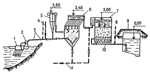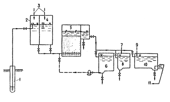 Черт. 41. Принципиальная схема работы станции обесфторивания воды 1 - артезианская скважина; 2 - зарядная камера смесителя; 3 - подача коагулянта; 4 - рабочая камера смесителя; 5 - контактный осветлитель; 6 - резервуар сброса первого фильтрата; 7 - подача соды; 8 - резервуар-отстойник промывной воды; 9 - подача хлора; 10 - резервуар чистой воды; 11 - подача воды потребителю Сточные воды от промывки контактных осветлителей следует сбрасывать в резервуар-отстойник промывных вод. После отстаивания и нейтрализации щелочью осветленную воду или направляют в голову сооружений, или сбрасывают в канализацию. Сырой осадок подают на сооружения по его обработке. 13.7. Контактную камеру следует устраивать по типу входной камеры, применяемой для станций контактного осветления при осветлении и обесцвечивании воды (по СНиП 2.04.02-84). Время пребывания воды в зарядной секции должно составлять 2 - 3 мин в расчете на зарядку одного контактного осветлителя, в рабочей секции - 3 - 5 мин в расчете на общий расход воды станции. Конструктивно-технологические решения контактных осветлителей станции обесфторивания воды рекомендуется принимать также в соответствии со СНиП 2.04.02-84. Скорость фильтрации принимают равной 3 - 4 м/ч (при содержании фтора в исходной воде 4 - 5 мг/л) и 4 - 5,5 м/ч (при исходном содержании фтора менее 4 мг/л). Остальные параметры принимают следующими: высоту слоя фильтрующей загрузки - 2,0 м; эквивалентный диаметр загрузки - 1,0 - 1,2 мм; коэффициент неоднородности - 2,2 - 2,5. Продолжительность цикла при указанных параметрах рекомендуется принимать 12 - 18 ч в зависимости от исходного содержания фтора. 13.8. Проектирование реагентного хозяйства следует осуществлять в соответствии со СНиП 2.04.02-84. Ориентировочные дозы реагентов рекомендуются следующие: доза коагулянта - сернокислого алюминия - по безводному продукту: зарядная - 300 - 500 мг/л, рабочая - 65 - 130 мг/л; доза соды для нейтрализации промывных вод и осадка - 50 - 80 мг/л; доза полиакриламида (ПАА) - 0,1 - 0,3 мг/л. Применение ПАА рекомендуется предусматривать при содержании фтора в исходной воде свыше 3 мг/л. ПАА вводят в конце рабочей секции контактной камеры. Параметры промывки контактных осветлителей (интенсивность, продолжительность) принимают в соответствии со СНиП 2.04.02-84. Обеззараживание обесфторенной воды производят с учетом местных условий и в соответствии с общими рекомендациями СНиП 2.04.02-84. Резервуар-отстойник промывных вод следует рассчитывать на время пребывания их не менее 2 ч. Сооружения и устройства по обработке промывных вод и осадка проектируют в соответствии со СНиП 2.04.02-84, при этом могут быть приняты следующие ориентировочные расчетные параметры: концентрация твердой фазы уплотненного осадка после 6 - 8-часового уплотнения - 1,5 - 1,8 г/л; объем осадка - 2,5 - 3 % количества промывных вод. 14. УСТАНОВКИ ТИПА «СТРУЯ» ДЛЯ ОЧИСТКИ ПОВЕРХНОСТНЫХ И ПОДЗЕМНЫХ ВОДНАЗНАЧЕНИЕ И ОБЛАСТЬ ПРИМЕНЕНИЯ14.1. Установки типа «Струя» представляют собой набор элементов полной заводской готовности, монтируемых на месте применения и серийно выпускаемых отечественной промышленностью. Они предназначены для очистки (осветления и обесцвечивания) поверхностных вод, а также для обезжелезивания, обесфторивания и умягчения подземных вод и могут быть использованы при водоснабжении сельских и малонаселенных мест, баз отдыха, вахтовых поселков и т.