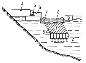 Черт. 33. Сооружения для очистки высокомутных вод с плавучим водозабором-осветлителем 1 - плавучий водозабор-осветлитель; 2 - плавучая насосная станция; 3 - трубопровод с шарнирным соединением; 4 - подача первичного хлора и реагентов; 5 - вихревой смеситель; 6 - тонкослойный осветлитель системы АзНИИВП-2; 7 - скорый фильтр; 8 - вторичное хлорирование; 9 - резервуар чистой воды; 10 - трубопровод для подачи чистой воды для промывки фильтров; 11 - трубопровод для удаления осадка из тонкослойного осветлителя и скорого фильтра 10.6. Несмотря на высокую эффективность выделения взвеси в водозаборе-осветлителе, на береговые сооружения может поступать вода со значительным содержанием взвеси (5 - 10 тыс. мг/л и более). В связи с этим было разработано специальное сооружение - тонкослойный осветлитель системы АзНИИВП-2, способный воспринимать указанные нагрузки и обеспечивать достаточно высокий эффект очистки воды. Для полной очистки должны быть использованы фильтры, имеющие грязеемкую загрузку, выполненную из таких фильтрующих материалов, как дробленые цеолиты, керамзит, гранодиорит и т.п. ПЛАВУЧИЙ ВОДОЗАБОР-ОСВЕТЛИТЕЛЬ10.7. Плавучий водозабор-осветлитель (черт. 34) представляет собой прямоугольную в плане емкость без донной осадочной части, оборудованную наклонными тонкослойными элементами в виде пакета трубок или пластин (полок). Черт. 34. Плавучий водозабор-осветлитель 1 - обойма тонкослойных элементов; 2 - ячеистая решетка; 3 - тонкослойные элементы; 4 - шарнирное соединительное устройство; 5 - плавучая насосная станция; 6 - гибкое соединительное устройство; 7 - карман сбора осветленной воды; 8 - желоба для сбора осветленной воды; 9 - понтон В донной части осветлителя к кромкам тонкослойных каналов прикреплены вертикальные поперечные и продольные перегородки, образующие ячеистые блоки (решетки). Плавучий осветлитель снабжен желобами для сбора осветленной воды, из которых она поступает в сборный карман, соединенный с помощью гибкой трубы или шарнирного устройства со всасывающими линиями плавучей насосной станции. Тонкослойный водозабор-осветлитель удерживается на плаву благодаря понтону. 10.8. Предельно допустимая производительность плавучего осветлителя определяется исходя из следующего соотношения, отвечающего действующим правилам охраны поверхностных вод от загрязнения сточными водами: