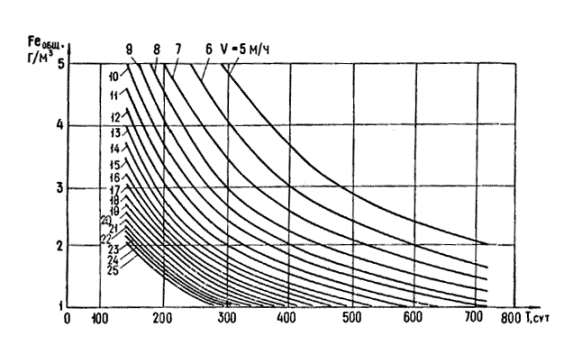 где Q - производительность установки, м3/сут; Т - продолжительность работы установки, принимаемая не более 22 ч с учетом указаний п. 11.17; v - принятая скорость фильтрования, м/ч. Скорость фильтрования принимают 6 - 20 м/ч с учетом содержания железа в исходной воде и продолжительности фильтроцикла в соответствии с номограммой (черт. 37). 11.9. Число фильтров должно быть не менее двух. Один фильтр допускается для установок производительностью до 1000 м3/сут.