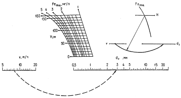 Черт. 37. Номограмма зависимости продолжительности фильтроцикла от исходного содержания железа и скорости фильтрования 11.10. Для климатических районов с расчетной зимней температурой воздуха не ниже минус 30 °С допускается размещение фильтров вне здания. 11.11. Конструктивно фильтр состоит из металлического корпуса, в верхней части которого расположены смеситель и разбрызгивающее устройство, в нижней части - решетка для поддержания загрузки в незатопленном состоянии; под решеткой установлен поплавковый стабилизатор уровня воды. Из нижней части корпуса фильтра выведены водоотводящий и воздухоотводящий трубопроводы. Примечание. Чертежи фильтра и стабилизатора уровня разработаны ЦНИИЭП инженерного оборудования. Для разбрызгивания воды могут применяться оросители пенные дренчерные ОПД-З и ОПД-3,5. 11.12. Высота фильтрующей загрузки принимается равной 1,6 м. Допускается увеличение высоты загрузки до 2 м исходя из конструктивных возможностей фильтров. 11.13. Гранулометрический состав загрузки принимается с учетом содержания железа в исходной воде и принятой скорости фильтрования (по черт. 38). Для увеличения грязеемкости загрузка принимается с убывающей крупностью фракций (в направлении сверху вниз). При этом рекомендуется разделять общую высоту загрузки на 3 - 4 слоя различной крупности. Черт. 38. Номограмма для определения эквивалентного диаметра зерен загрузки Fеобщ - исходное содержание железа в воде; Н - ордината поля центров по высоте слоя загрузки; v - шкала скорости фильтрования; dэ - шкала эквивалентного диаметра зерен загрузки На черт. 38 приведен пример определения оптимальной крупности загрузки dэ для слоя толщиной 1,0 м при исходном содержании железа в воде 4 мг/л, скорости фильтрования 8 м/ч; dэ составил 2,9 мм. 11.14. Производительность компрессоров или воздуходувных агрегатов определяется из необходимости обеспечения отношения количества подаваемого воздуха к количеству обрабатываемой воды 3 : 1, а необходимый напор рассчитывается исходя из необходимого давления воды после фильтров в зависимости от принятой схемы водоснабжения объекта (с одним подъемом, с двумя подъемами, с резервуарами, водонапорной башней и т.д.). 11.15. В составе установки необходимо предусматривать один резервный компрессор (воздуходувный агрегат). 11.16. Фильтры следует выключать на регенерацию при достижении предельной потери напора 10 - 12 м. Регенерацию фильтрующей загрузки следует производить 10 %-ным раствором соляной кислоты в течение 24 ч с последующей промывкой водой. Вместо регенерации допускается замена отработанной загрузки новым фильтрующим материалом. 11.17. При круглосуточной эксплуатации установок необходимо через каждые 22 ч производить продувку фильтров воздухом в течение 2 ч, на этот период подача воды прекращается. Перед пуском фильтра в эксплуатацию производится обеззараживание загрузки хлорной известью (хлорной водой) при концентрации хлора 50 мг/л и времени контакта 24 ч. Затем следует промывка фильтра водой. МЕТОДИКА ПРОБНОГО ОБЕЗЖЕЛЕЗИВАНИЯ11.18. Пробное обезжелезивание методом водовоздушного фильтрования производится с целью определения возможности очистки воды данного качества и основных технологических параметров работы установки (скорости фильтрования, гранулометрического состава, высоты и материала загрузки, времени фильтроц