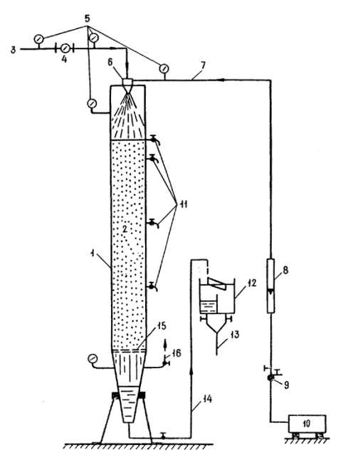 10.23. Расчетно-конструктивные параметры тонкослойных каналов и систему отводящих желобов следует определять из условий, приведенных выше для плавучего отстойника. Скорость выпадения взвеси при этом следует принимать 0,5 - 0,6 мм/с, а значение коэффициента k в формуле (40) равным 5 - 8. Общая потеря напора в осветлителе системы АзНИИВП-2 составляет 20 - 25 см. 10.24. Сброс осадка следует предусматривать без выключения осветлителя. Период работы между сбросами осадка и среднюю концентрацию уплотненного осадка следует определять в соответствии со СНиП 2.04.02-84. 11. УСТАНОВКИ ДЛЯ ОБЕЗЖЕЛЕЗИВАНИЯ ПОДЗЕМНЫХ ВОД МЕТОДОМ ВОДОВОЗДУШНОГО ФИЛЬТРОВАНИЯ11 Следует применять в экспериментальном порядке. СУЩНОСТЬ МЕТОДА И ОБЛАСТЬ ПРИМЕНЕНИЯ11.1. Метод водовоздушного фильтрования относится к безреагентным методам обезжелезивания подземных вод, при которых окисление железа, находящегося в бикарбонатной форме, происходит с помощью кислорода воздуха. 11.2. При применении данного метода водовоздушную смесь фильтруют на напорной установке через незатопленную зернистую загрузку. Одновременно с обезжелезиванием воды происходит удаление растворенных в ней газов (углекислого, сероводорода и др.). 11.3. Целесообразность использования данного метода устанавливают на основании данных, полученных в результате пробного обезжелезивания, проведенного непосредственно у источника водоснабжения (см. пп. 11.18 - 11.20). Для