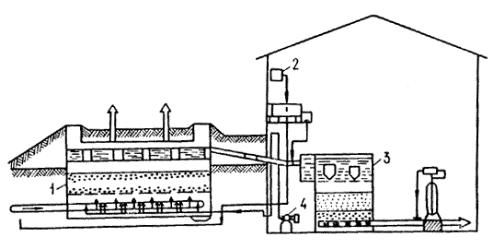 При определении общего расхода реагентов-окислителей для обработки воды необходимо учитывать их потребление также другими (кроме сероводорода) окисляющимися соединениями, которые находятся в воде. 12.6. Распределители и смесители реагентов с водой следует применять закрытого типа (см. разд. 1). Фильтры необходимо проектировать с водовоздушной промывкой, принимая дозу коагулянта на основании опытных определений. Ориентировочно она может быть принята 25 - 30 мг/л по безводному сернокислому алюминию. БИОХИМИЧЕСКИЙ МЕТОД11 Следует применять в экспериментальном порядке. 12.7. Метод очистки воды от сероводорода в реакторе биохимического окисления основан на использовании главным образом тионовых бактерий Thiobacillus thioparus. 12.8. В реакторе биохимического окисления исходная вода пропускается снизу вверх через затопленную зернистую загрузку и барботируется воздухом, в результате через 1 - 3 недели на загрузке развиваются микроорганизмы, окисляющие сероводород до серы и сульфатов. Увеличение продолжительности и интенсивности аэрации ведет к снижению в составе продуктов реакции содержания серы и увеличению концентрации сульфатов. В состав очистной установки входят (черт. 40): реактор биохимического окисления; воздуходувные агрегаты фильтрами для очистки воздуха, подаваемого в реактор биохимического окисления; бачок для приготовления раствора биогенного компонента - триполифосфата натрия; скорые фильтры. Реакторы располагают вне здания, предусматривая специальные мероприятия против замерзания, а также против загазованности колодцев и коллекторов. Черт. 40. Сооружения для удаления марганца из воды биохимическим методом 1 - реактор биохимического окисления; 2 - бачок для приготовления раствора триполифосфата натрия; 3 - скорый фильтр; 4 - воздуходувные агрегаты с фильтрами для очистки воздуха 12.9. Метод следует применять при температуре воды 6 - 30 °С, общем содержании сероводорода до 50 мг/л, железа двухвалентного - до 0,3 мг/л, рН исходной воды - 7 - 9. Эффективность очистки воды от сероводорода после ее обработки в реакторах и фильтрах составляет 95 - 99 %. 12.10. В случае очистки от сероводорода подземных или дренажных вод, мутность которых превышает 15 мг/л, перед реактором биохимического окисления необходимо устраивать сооружения для осветления воды с целью предотвращения засорения распределительной системы и зернистой загрузки реактора. 12.11. Необходимость фильтрования воды, прошедшей через реактор биохимического окисления, выясняется в результате технологических изысканий. Фильтрование предусматривается, если мутность воды, предназначенной для питьевых целей, после реактора биохимического окисления превышает 1,5 мг/л. Фильтры следует применять с загрузкой крупностью 0,7 - 1,6 мм и высотой слоя 1,5 - 2 м. Проектирование фильтров надлежит осуществлять в соответствии со СНиП 2.04.02-84. 12.12. В тех случаях, когда фильтрование без коагуляции не обеспечивает очистку воды от активного ила, образующегося в реакторе биохимического окисления, перед фильтрами воду следует обрабатывать коагулянтом. После фильтров надлежит предусматривать хлорирование воды дозой, равной 2 - 3 мг/л. Промывка фильтров - водовоздушная. 12.13. Промывные воды фильтров после обработки их коагулянтом или флокулянтом и отстаивания целесообразно возвращать в реактор биохимического окисле