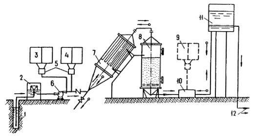 Черт. 42. Принципиальная схема работы установок типа «Струя» а - установка производительностью 100 и 400 м3/сут; б - установка производительностью 200 и 800 м3/сут; 1 - насос подачи воды; 2 - сетчатый фильтр; 3 - смесительная диафрагма; 4 - ввод коагулянта; 5 - блок коагулирования; 6 - блок обеззараживания; 7 - насосы-дозаторы; 8 - операционная задвижка; 9 - отстойники; 10 - фильтры; 11 - ввод хлорреагента; 12 - водонапорная башня; 13 - промывной отсек; 14 - подача воды потребителям Смешение реагентов с обрабатываемой водой следует осуществлять непосредственно в насосе или в напорном трубопроводе до камеры хлопьеобразования. Для задержания крупных плавающих примесей после насоса устанавливается грубый фильтр. Пройдя грубый фильтр, вода поступает в камеру хлопьеобразования, в которой после ввода коагулянта образуются хлопья гидрата окиси алюминия с извлеченными из воды взвешенными и коллоидными частицами. Образовавшиеся в камере хлопья непосредственно поступают в отстойник. При движении воды в отстойнике в трубах и межтрубном его пространстве происходят выпадание взвеси и интенсивное ее осветление. Одновременно производит сползание части осадка в камеру хлопьеобразования. Отстоенная вода с остаточной мутностью проходит фильтр, в котором происходит ее окончательная очистка. Пройдя фильтр, вода под остаточным напором поступает в бак водонапорной башни, откуда направляется в зависимости от условий в водопроводную сеть, в резервуар или к насосной станции (второго подъема). В напорной башне предусматривается отбор воды на промывку с обеспечением гарантированного запаса. Для удаления накапливающихся в установке загрязнений предусмотрена ее периодическая промывка. При этом промывная вода из башни, поступая на фильтр снизу вверх, расширяет его фильтрующую загрузку, вынося накопившиеся за фильтроцикл загрязнения, а затем поступает в отстойник и смывает накопившийся в нем осадок. Оборудование для коагулирования воды включает двухсекционный бак с переносной электромешалкой и насос-дозатор для введения раствора реагента. Для обеззараживания используются электролизные установки ЭН-1 или ЭН-5. При их отсутствии осуществляются приготовление и дозирование хлорреагентов - гипохлорита кальция или хлорной извести. 14.8. Основными отличительными элементами установок для очистки подземных вод (черт. 43) являются промежуточный бак-аэратор (газоотделитель) и блок для приготовления щелочных реагентов (при умягчении и обезжелезивании воды). В ряде случаев может потребоваться более производительное дозировочное оборудование. Кроме того, при определенных условиях для обеззараживания воды вместо хлорреагентов могут быть использованы бактерицидные установки (см. п. 14.13). Черт. 43. Принципиальная схема обесфторивания, обезжелезивания и умягчения воды на установках типа «Струя» 1 - водозабор; 2 - аэрационный бак; 3 - блок подщелачивания воды; 4 - блок коагулирования воды; 5 - насосы-дозаторы; 6 - насос исходной воды; 7 - тонкослойный отстойник; 8 - скорый фильтр; 9 - баки обеззараживания воды хлорреагентом; 10 - блок обеззараживания воды на бактерицидном аппарате; 11 - водонапорная башня; 12 - подача воды потребителям 14.9. Схема работы установки в режиме обезжелезивания воды следующая. Исходная вода, поступающая от скважин, обогащается кислородом с помощью разбрызгивания ее через 