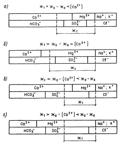 Примечание. Нижние значения коэффициентов изменения производительности установок необходимо принимать для более высоких концентраций железа в воде, при использовании в качестве реагентов кальцинированной соды и межпромывочном цикле работы установки не менее 24 ч. 14.23.4. Толщину слоя песчаной загрузки рекомендуется принимать равной 1,5 - 1,8 м; крупность зерен загрузки 0,6 - 2,0 мм при эквивалентном диаметре 0,8 - 0,9 мм и коэффициенте неоднородности 2,0 - 3,0. Параметры промывки, интенсивность и продолжительность принимаются такими же, как для установок, применяемых для очистки поверхностных вод. 14.24. Умягчение воды: 14.24.1. Определение необходимых доз щелочных реагентов следует производить в соответствии с качеством обрабатываемой воды, в зависимости от соотношения между основными компонентами жесткости и характеристикой ее солевого состава. Целесообразно предварительно составить ионную диаграмму гипотетического состава основных солей, находящихся в воде. Для облегчения выполнения расчетов на черт. 44 приведены диаграммы характерных типов жестких вод. Диаграммы характеризуют воды, содержащие как кальциевую, так и магниевую жесткость бикарбонатного и сульфатно-хлоридного типов, умягчение которых требует проведения декарбонизации или известково-содовой обработки. 14.24.2. Из воды удаляется только карбонатная кальциевая жесткость (черт. 44, а), определяемая по формуле Жо - [Са2+] < Жт > Жо - Жк, (51) где Жт, Жо, Жк - требуемая (стандартная для коммунального водоснабжения), общая и карбонатная жесткости исходной воды, мг-экв/л; [Са2+] - исходная концентрация ионов кальция, мг-экв/л.