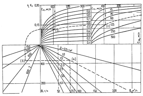 * Зависит от содержания хлоридов, сульфатов и требуемой дозы хлора на обеззараживание воды. Для конкретного объекта производительность установки может быть определена по номограмме (черт. 45). Взаимное влияние сульфатов и хлоридов на процесс электролиза определяется коэффициентом Кс (точка 1). Данные по концентрации хлоридов и величине коэффициента Кс позволяют установить выход хлора по току (точка 2). Выход хлора по току при заданной токовой нагрузке (точка 3) и требуемая доза хлора (точка 4) определяют максимально возможную производительность установки (точка 5) на объекте применения. 15.13. Независимо от применяемых схем водоснабжения места расположения установок для обеззараживания прямым электролизом обусловлены сущностью метода: они должны всегда располагаться перед контактными емкостями (резервуарами чистой воды, водонапорными башнями и т.п.), которые, так же как в случае обычного хлорирования, позволяют обеспечивать необходимое время контакта. 15.14. Установки должны эксплуатироваться в помещении с температурой от 1 до 35 °С и относительной влажностью до 80 %. На одном объекте целесообразно устанавливать не более 2 - 3 параллельно работающих установок, из которых одна резервная. 15.15. При наличии в схеме водоснабжения установки для очистки воды (типа «Струя», установки или станции для обезжелезивания и др.) установки типа «Поток» целесообразно располагать в тех же помещениях. 15.16. При использовании подземных вод, не требующих специальной очистки и подаваемых в сборные резервуары, возможны различные варианты размещения аппаратуры. При наличии над скважиной павильона установку наиболее целесообразно размещать именно в нем. Когда павильон отсутствует или вода подается в сборный резервуар от нескольких скважин, аппаратуру можно монтировать в насосной (второго подъема) или в небольшом отдельно стоящем здании. В тех случаях, когда вода поступает в водонапорную башню, а у ее основания имеется помещение, установку можно располагать на этих площадях. Черт. 45. Номограмма для определения производительности установки типа «Поток» Во всех случаях размещения установки электролизер необходимо устанавливать на обводной линии основной магистрали, подающей воду в контактный резервуар. На отрезке основной магистрали между подсоединениями обводной линии необходимо устанавливать задвижку. Подводящий трубопровод оборудуется измерителем расхода подаваемой воды. 15.17. Монтаж блока электропитания установок следует производить в помещении согласно электрической схеме и ПУЭ. С целью снижения падения напряжения в соединительных кабелях расстояние между выпрямителем и электролизером должно быть по возможности минимальным. 15.18. При привязке и монтаже установок можно пользоваться «Схемами компоновок установок для обеззараживания природных и сточных вод прямым электролизом», разработанными Гипрокоммунводоканалом. 16. МЕХАНИЧЕСКОЕ ОБЕЗВОЖИВАНИЕ ОСАДКОВ, ОБРАЗУЮЩИХСЯ НА СТАНЦИЯХ ВОДОПОДГОТОВКИНАЗНАЧЕНИЕ И ОБЛАСТЬ ПРИМЕНЕНИЯ16.1. Рассматриваемые методы и устройства предназначены для механического обезвоживания осадков, образующихся на станциях осветления, обезжелезивания и умягчения природных вод, с использованием серийно выпускаемого отечественного оборудования. 16.2. Механическое обезвоживание может найти применение при обрабо