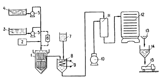 Черт. 46. Технологическая схема обработки осадков на камерном фильтр-прессе 1 - уплотнитель; 2 - дозатор ПАА; 3 - усреднитель-отстойник осадков из отстойников или осветлителей со взвешенным слоем осадка; 4 - усреднитель-отстойник промывных вод фильтровальных сооружений; 5 - насос; 6 - сборник осадка; 7 - дозатор флокулянтов и вспомогательных веществ; 8 - промежуточная емкость; 9 - нагревательный элемент; 10 - компрессор; 11 - монжус; 12 - камерный фильтр-пресс; 13 - транспортер; 14 - бункер; 15 - автосамосвал Уплотненный осадок перелавливают из уплотнителей в емкость для подготовки его к механическому обезвоживанию. В зависимости от вида осадка и способа его подготовки в емкость с помощью дозаторов могут подаваться известь, флокулянты и присадочные материалы. Помимо этого, емкость может быть оборудована системой подогрева осадка. Подготовленный к механическому обезвоживанию осадок отводится в монжус, откуда с помощью компрессора передавливается в камерный фильтр-пресс. Обезвоженный осадок с помощью транспортера через бункер удаляется автотранспортом с территории станции. Фильтрат после фильтр-прессов отводится в канализационные сети. 16.9. При использовании для механического обезвоживания гидроксидных осадков вакуум-фильтров монжус следует заменить плунжерными или шнековыми насосами. 16.10. В конструктивном отношении усреднители-отстойники должны обеспечивать возможность эффективного отведения осветленной воды и осадка на дальнейшую обработку. 16.11. Конструкции уплотнителей зависят от качества обрабатываемого осадка. Для осадков маломутных цветных вод следует стремиться, чтобы отношение диаметра и глубины уплотнителя составляло 1 : 2. С увеличением мутности исходной воды указанное отношение можно увеличивать, и при уплотнении осадков из вод с мутностью свыше 100 мг/л в качестве уплотнителей могут быть использованы радиальные отстойники диаметром до 18 м. 16.12. Подготовку уплотненного осадка к обезвоживанию можно осуществлять либо в специальной емкости, либо непосредственно в монжусе. ПОДГОТОВКА ОСАДКА К МЕХАНИЧЕСКОМУ ОБЕЗВОЖИВАНИЮ16.13. Механическое обезвоживание осадков, образующихся на станциях обезжелезивания и умягчения подземных вод, следует осуществлять после их уплотнения без дополнительной подготовки. 16.14. Механическое обезвоживание гидроксидных осадков поверхностных природных вод следует осуществлять только после предварительной подготовки, обеспечивающей изменение их исходной физико-химической структуры. 16.15. Предварительная подготовка гидроксидных осадков к обезвоживанию может включать их уплотнение в сооружениях вертикального или радиального типа, коагуляцию химическими реагентами, добавление вспомогательных веществ, нагрев до 60 - 98 °С, замораживание-оттаивание. Примечания: 1. Замораживание-оттаивание следует предусматривать при подготовке к обезвоживанию осадков маломутных цветных и высокоцветных вод, обладающих наиболее низкой водоотдающей способностью. 2. Выбор температуры нагрева осадка следует осуществлять с учетом возможностей обезвоживающих аппаратов. 16.16. Уплотнение гидроксидных осадков маломутных цветных вод следует производить в уплотнителях вертикального типа, оборудованных устройствами для непрерывного нарушения структуры осадка. Уплотнение осадков, полученных из поверхностных вод с мут
