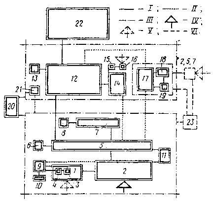 Рис. 33. Функционально-планировочные схемы связей складов 1 - сцена, карманы; 2 - дежурный склад объемных и станковых декораций; 3 - склад декораций текущего сезона; 4 - резервный склад объемных и станковых декораций; 5 - сейф; 6 - дежурный склад звукотехнической аппаратуры; 7 - дежурный склад электроаппаратуры и электрореквизита; 8 - склад, электроаппаратуры и электрореквизита текущего сезона; 9 - дежурный склад бутафории, мебели и реквизита; 10 - склад бутафории, мебели и реквизита текущего сезона; 11 - резервный склад бутафории, мебели и реквизита; 12 - кладовая машиниста сцены; 13 - к помещению для монтажа станковых декораций; 14 - к подъездным путям автотранспорта; 15 - склад костюмов, головных уборов и белья текущего сезона; 16 - дежурные костюмерные; 17 - склад обуви текущего сезона; 18 - резервный склад костюмов, головных уборов и белья; 19 - к мастерским пошивочной, головных уборов, трикотажной, обуви, красильной; к артистическим уборным; условные обозначения связей см. рис. 25 3.113. Расположение дежурного склада декораций и карманов сцены, склада звукотехнической аппаратуры и дежурного склада электроаппаратуры и электрореквизита, дежурного склада мебели, бутафории и реквизита и выходов актеров по периметру сцены проектируется так, чтобы исключить пересечение потоков движения актеров и оформления. Связь дежурных складов с комплексом художественно-производственных мастерских, расположенных в пределах общей территории в подсобном корпусе, рекомендуется осуществлять закрытым переходом с размерами и оборудованием, допускающим транспортировку громоздких декораций. Это особенно рекомендуется для районов с низкими среднегодовыми температурами. 3.114. Для резервных складов рекомендуется горизонтальный способ хранения в контейнерах или полуконтейнерах (флетах) объемных и станковых декораций, мебели и крупной бутафории. Реквизит может храниться на стеллажах в чехлах или ящиках. Костюмы, головные уборы, белье и обувь - в одном помещении. Костюмы на двухъярусных вешалках, головные уборы - в специальных круглых кофрах, белье - в ящиках и корзинах, обувь - в коробках или мешках, сапоги - в подвешенных чехлах. Исходя из принятого способа хранения определяются размеры и пропорции резервных складов. Помещения этой группы проектируются без естественного освещения. Резервные склады могут быть как в подсобно-производственном корпусе театра, так и отнесены от него на значительное расстояние. В перспективе возможен вариант централизованного контейнерного хранения оформления в общегородских складах с высокой степенью механизации трудоемких работ. 3.115. Функционально-планировочные схемы связей складов приведены на рис. 33. ПРОИЗВОДСТВЕННЫЕ ПОМЕЩЕНИЯ3.116. Особенность театрального производства заключается в том, что при изготовлении многие предметы приходят через несколько производственных помещений (художественно-производственных мастерских). При этом каждая мастерская выполняет свою технологическую функцию - изготовляет определенные элементы оформления. 3.117. При выборе предпочтительного способа размещения производственных помещений (в отдельном корпусе, в централизованных комбинатах, в основном здании театра) учитывается назначение театра, возможно уже сложившиеся традиции, расположение отведенной площадки для строительства, ее рельеф и места во
