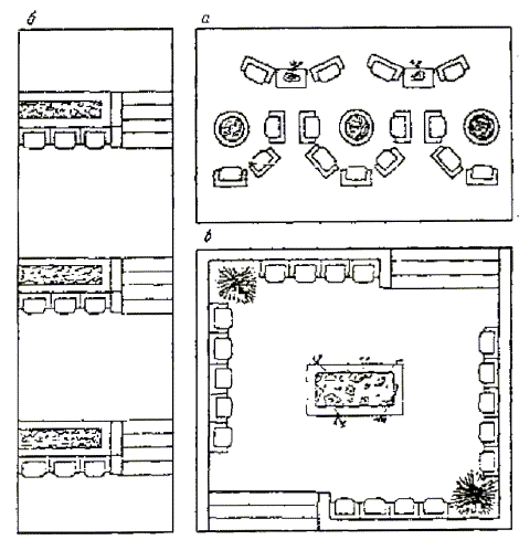 Рис. 7. Примеры схем построения зрительского комплекса а - выделение зоны тихого отдыха зеленью, средствами дизайна; б, в - выделение зоны тихого отдыха уровнем пола 3.11. Детская комната в театрах для взрослых предназначается для пребывания детей дошкольного и младшего школьного возраста на время посещения родителями спектакля. В детской комнате рекомендуется предусматривать места для отдыха и игр, для педагога, а также санитарный узел. Площадь детской комнаты целесообразно определять из расчета 2,5 м2 на одного ребенка при количестве детей, равном 2 % вместимости зрительного зала. 3.12. Площадь кабинета главного администратора рекомендуется принимать 12 - 25 м2, кладовой афиш – 4 - 6 м2, а комнаты распространителей билетов – 6 - 10 м2 в зависимости от значимости театра (см. рис. 5). При этом кабинет или комнату рекомендуется проектировать смежно с кабиной дежурного администратора и с входом в нее. Двери из кабинета главного администратора и комнаты распространителей билетов рекомендуется устраивать ведущими в тамбур или отрезок коридора, сообщающийся с одним из вестибюлей. В театрах большой вместимости возможно проектировать отдельное помещение для второго администратора, рабочее место которого во всех прочих случаях может находиться в комнате распространителей билетов. 3.13. Фойе рекомендуется организовывать по принципу дифференциации пространства, членя его на зоны для тихого и активного отдыха. Зоны тихого отдыха размещают вне направлений активного движения и выделяют различными архитектурными средствами, создавая интимные пространства. Зоны тихого отдыха рекомендуется оборудовать креслами, диванами, банкетками из расчета на единовременное пользование 8 - 10 % зрителей (рис. 7). Зону для активного отдыха также рекомендуется расчленять, устраивая залы и протяженные пути перемещения. Распространенными способами зонирования являются зелень, мебель, дизайнерское решение, перепады уровней потолка и пола, световая и цветовая композиция и пр. 3.14. Кулуары предназначены для рекреации и эвакуационных целей. Их ширина и длина определяются расчетом путей эвакуации по справочному пособию «Общие рекомендации». По расчету уточняется площадь кулуаров. В фондохранилище для одного спектакля в хранении требуется 0,1 м2, для места разборки и сортировки - 0,5 м2, для оперативного фонда, которым пользуются посетители – 10 - 12 м2, для работы сотрудника - 4 м2, для читательского места - 3 м2. Оперативный фонд, места для работы сотрудника и читательские могут размещаться в отдельной комнате. Целесообразно предусматривать пользование музеем и вне посещения спектакля; в отдельных случаях при музее возможно проектировать фотолабораторию и вестибюль с гардеробом. Длина стойки буфета принимается не менее 5 м, а количество посадочных мест - из расчета одно на 12 зрительских мест. Помимо обслуживания со стойки (только продажа еды) возможно предусматривать обслуживание за столами (по типу ресторана) с передвижных каталок, со стойки по типу барной (продажа еды и еда), автоматами, а также комбинированное. Расчетное количество мест может быть уменьшено за счет устройства столов без посадочных мест (по типу закусочных). Рядом с доготовочной и моечной могут проектироваться комната для сотрудников буфета и отдельный санитарный узел. Кладовую и тарную буфета рекомендуе