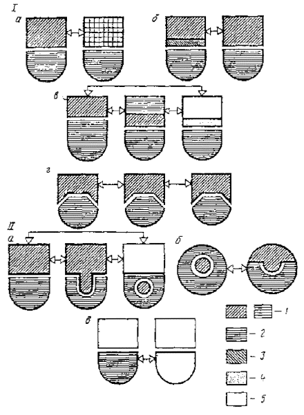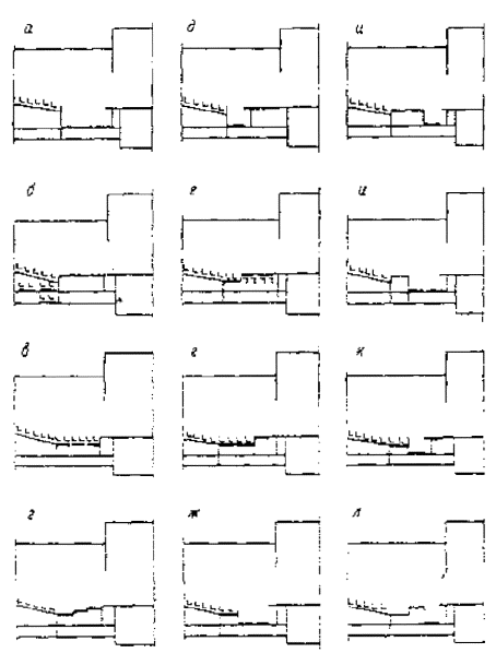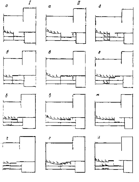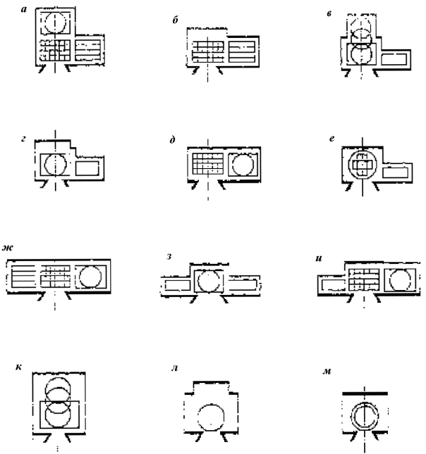 Рис. 8. Примеры основных схем построения глубиной колосниковой сцены с двумя карманами и арьерсценой (варианты механического оборудования показаны условно) При уменьшении глубины карманов до величины по табл. 2 сохраняется только возможность «челночной» смены объемных декораций или рельефа на части сцены. Отсутствие одного из карманов уменьшает постановочные возможности сцены, не позволяя осуществлять «челночную» смену декораций или рельефа сцены. Отсутствие обоих карманов лишает сцену перечисленных возможностей. Традиционный вариант схемы 1 (рис. 10) - наиболее отработанная и повсеместно применяемая схема. Все схемы с увеличенными для размещения соответствующего оборудования карманами и (или) арьерсценой дороже, более трудоемки в изготовлении и эксплуатации, нежели традиционный вариант; применяются в отечественной практике редко. Рис. 9. Примеры основных схем построения глубинной колосниковой сцены, карманов и арьерсцены (варианты механического оборудования показаны условно) а - г - с одним карманом и арьерсценой; д - е - с одним карманом без арьерсцены; ж - и - с двумя карманами; к - л - с арьерсценой без карманов; м - без карманов и арьерсцены 3.37. Применение сцен рекомендуется осуществлять согласно табл. 3. Таблица 2