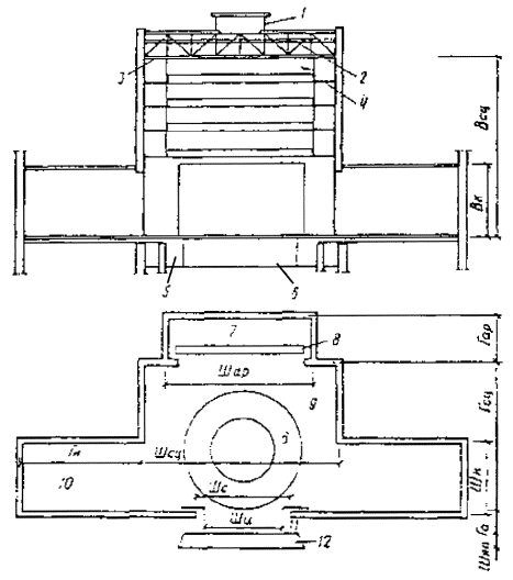 Рис. 10. Схема построения глубинной колосниковой сцены в плане и по высоте (традиционный вариант) 1 - дымовые клапаны; 2 - штанкетная площадка; 3 - колосники сцены; 4 - рабочие галереи; 5 - трюм; 6 - вращающиеся круг и кольцо врезного типа; 7 - арьерсцена; 8 - крышка сейфа для скатанных декораций; 9 - сцена; 10 - карман сцены; 11 - авансцена; 12 - проем оркестровой ямы; Ш - ширина сцены; Г - глубина сцены; В - высота сцены; Шк - ширина кармана; Гк - глубина кармана; Вк - высота кармана; Шар - ширина арьерсцены; Гар - глубина арьерсцены; Шс - ширина строительного портала; Ши - ширина игрового портала; Га - глубина авансцены; Шяп - ширина проема оркестровой ямы Таблица 3