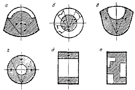 Рис. 3. Схемы летних театров I - летний концертно-театральный зал (типы сцен: а - глубинная, изолированная от окружения; б - трехсторонняя - панорамная, открытая; в - глубинная-трехсторонняя-центральная закрытая, с трансформацией зрительских мест; г - глубинная-трехсторонняя с трансформирующимся задником); II - природный и историко-архитектурный театр (типы сцен: а - фронтальная протяженная, с несколькими сценическими площадками; б - кольцевая с вращающимся амфитеатром; в - трехсторонняя - кольцевая; г - комбинированная с широким фронтам соприкосновения с окружением; д - панорамная с природным или архитектурным фоном); III - кооперация сооружения (а - открытый амфитеатр с театром круглогодичного действия; б - открытый амфитеатр на крыше городского зала; в - открытый амфитеатр с закрытым танцевальным залом; г - несколько амфитеатров; 1 - сценическая площадка; 2 - сооружение иного назначения) 3. Вместимость ландшафтного театра в природном окружении (природного театра) может быть 2000 - 3000 мест; вместимость театра в историко-архитектурной среде зависит от особенностей среды, но желательна не более, чем у природного театра. Для природного театра характерны включение окружения в зону сценического действия, протяженная фронтальная сцена с устройством нескольких сценических площадок на разных уровнях, с использованием разницы в рельефе, камней, скал и пр. Сценическая площадка природного театра не требует сценической механизации, основное постановочное средство такого театра - сценическое освещение, световые или водные занавесы; возможно включение в зону сцены водных поверхностей или фонтанов. Артисты оркестра в таких театрах могут располагаться под первыми рядами зрительских мест, находятся в оркестровой яме, встроенной в рельеф для укрытия от осадков и пр. 4. Расположение помещений, обслуживающих сцену, административных и пр. зависит от степени связи сценической площадки с окружением. Желательно располагать их скрыто от глаз зрителей (под амфитеатром, с использованием перепадов рельефа); возможно использование временных привозных устройств. 5. Один из путей создания и развития условий для постановки спектаклей в природном окружении - кооперация летнего театра с театром круглогодичного действия, при которой желательно для летнего театра использовать сценические помещения театра круглогодичного действия. Размещение таких кооперированных театров наиболее целесообразно в зеленой зоне, на интенсивно озелененном участке. 6. По степени открытости летние театры подразделяются на: открытые, крытые и закрытые. Закрытые летние театры возможны в районах IВ (РСФСР - Дальний Восток), IIБ (Север Прибалтики), IIВ (РСФСР - Европейская часть к северу от Москвы), IIIБ (РСФСР район Орджоникидзе), а крытые с любыми покрытиями (мягкими, жесткими, стационарными или трансформируемыми) - в районе IВ (РСФСР - Западная и Восточная Сибирь до Иркутска, Читы), IIВ (к югу от Москвы), IIIБ. Открытые летние театры или театры с трансформируемыми мягкими покрытиями возможны в районе IIВ (например, РСФСР - исключая район Куйбышева и Казани), IIIВ, с трансформируемыми жесткими - в IIIБ (например, район Махачкалы), с теми и другими - в Средней Азии. Балетные театры1. Организационной базой балетного театра могут быть ансамбли классического и современного балета с возможным включением в них ансам