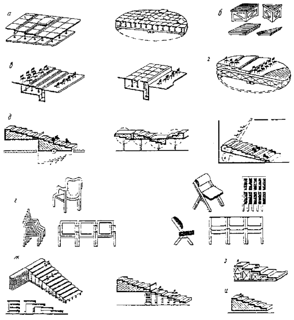 Рис. 15. Трансформации оркестровой ямы (с тремя подъемно-опускными площадками) а - и - см. рис. 14; к - увеличение глубины авансцены и вместимости зрительного зала с устройством оркестровой ямы; л - устройство ступенчатого спуска с авансцены в зрительный зал Этот вид пространственной трансформации рекомендуется применять при необходимости максимально использовать площади зала и стационарные зрительные места при одновременном учете требований разных мероприятий как к масштабу, так и пространственной организации демонстрационного комплекса. При этом могут обеспечиваться высокие качества условий проведения и восприятия каждого мероприятия. Достигаются эти цели на основе пяти основных способов трансформации: поперечного деления; продольного деления; отделения балконов; экседрального деления; полигонального деления. Рис. 16. Основные средства планировочной трансформации а - подъемно-опускные площадки; б - пратикабли; в - подъемно-опускные площадки и трансформируемый барьер; г - поворотная часть сцены и партера (в горизонтальной плоскости); д - поворотные секции партера (в вертикальной плоскости); е - трансформируемые зрительские места; ж - блитчеры; з - станки с местами; и - места на передвижных станках Средства трансформации - перегородки - бывают в основном сплошными (жесткими в виде перегородок-стен или гибкими) и складными. Складные перегородки более компактны и мобильны, но проблема их звукоизоляции (большое количество стыков в самой плоскости перегородки) более сложная. Используются также поворотные части партера со стенами-перегородками (стационарными). Основные способы установки и съема перегородок характеризуют их как: выдвижные, подъемные, опускные, поворотные (вокруг горизонтальной или вертикальной оси). Одно из решающих значений для обеспечения звукоизоляции перегородок имеет герметичность соединений и стыков перегородок, для чего используются различные типы уплотнения, основными из которых являются: фрикционные, легкосплавные, а также лабиринтные. Для хранения перегородок предусматриваются места (ниши, сейфы и т.п.), преимущественно механические средства съема и установки. Необходимо также учитывать, что после такой трансформации получается многозальный комплекс с вытекающими из этого требованиями ко всем зрительским и обслуживающим помещениям каждого из получаемых залов использовать эффект сообщающихся систем залов. 3.61. Третий вид - объединение пространства зала с другими залами в одно целое. Этот вид трансформации позволяет реализовать преимущества сообщающихся систем залов: обеспечение более равномерной загрузки залов и большой эффективности использования зрительского места, а также изменение пространственных решений зала и типов сцен. Решается эта задача на основе подключения основному залу других залов: сбоку; сзади; со стороны сцены. Возможно сочетание этих способов. При использовании третьего способа можно изменить глубинный тип сцены на центральную. Средства трансформации - аналогичны указанным во втором виде пространственной трансформации. 3.62. Четвертый вид - объединение пространства зала с другими помещениями в одно целое. Этот вид трансформации позволяет интенсифицировать использование основных помещений здания (кулуары, фойе, карманы сцены и т.д.), увеличивать размеры и вместимость