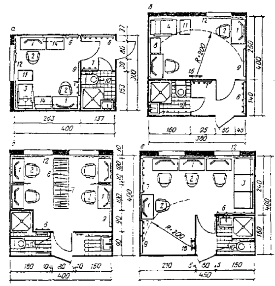 Рис. 22. Примеры планировки групповых артистических уборных а - для двух актеров драматического театра (общая площадь 12 м, в том числе санитарный узел 2,1 м2); б - для двух солистов балета (общая площадь 15 м, в том числе санитарный узел 2,2 м2); в - для трех актеров драматического театра (общая площадь 14 м2, в том числе санитарный узел 2,2 м2); г - для трех артистов балета (общая площадь 16 м2, в том числе санитарный узел 2,6 м2); д - для четырех актеров драматического театра (общая площадь 16 м2, в том числе санитарный узел 3,3 м2); г - для четырех артистов балета (общая площадь 18 м2, в том числе санитарный узел 2,4 м2); ж - для шести актеров драматического театра (общая площадь 18 м2, в том числе санитарный узел 1,6 м2); и - для шести артистов балета (общая площадь 18 м2, в том числе санитарный узел 1,6 м2) 3.86. Индивидуальные и большая часть групповых артистических уборных на 2 чел. располагаются на этаже сцены. Не рекомендуется размещать артистические уборные выше третьего этажа от уровня планшета сцены и ниже этажа, следующего за этой отметкой. Коммуникации из артистических уборных на сцену проектируются обособленными от других технологических коммуникаций. Ширина лестничных маршей в зоне артистических уборных целесообразна не менее 1,5 м, ширина коридоров при одностороннем расположении уборных - не менее 2 м, при двухстороннем - не менее 3 м. Общая длина пути от наиболее удаленной артистической уборной до сцены - не более 60 м, включая и вертикальные коммуникации. Артистические уборные рекомендуется проектировать, как правило, с естественным освещением.