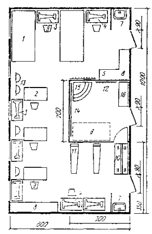 Рис. 37. Пошивочная мастерская с примерочной и закройной (вариант планировочного решения) 1 - стол рабочий, портновский; 2 - стол для ручных работ; 3 - машина швейная 1022 кл.; 4 - машина швейная специальная; 5 - шкаф канцелярский для документации; 6 - стол закройщика откидной; 7 - раковина; 8 - шкаф-стеллаж для материалов, инструментов и фурнитуры; 9 - стул вращающийся; 10 - тележка-вешалка для готовой продукции; 11 - доска гладильная; 12 - вешалка; 13 - манеж; 14 - зеркало большое, секционное; 15 - подиум для примерочной; 16 - стол канцелярский Габариты помещения прямо связаны с размерами сцены. Рабочая зона представляет собой прямоугольник, одна из сторон которого равна диаметру, а другая радиусу вращающегося круга сцены (диаметр составляет 1,4 ширины игрового портала, но не менее 10 м). Вспомогательная зона располагается по одну из сторон и имеет ширину, равную или превышающую 2 м. Размеры и пропорции помещения для монтажа декораций определяются достаточно жестко. Высота помещения рекомендуется равной высоте карманов основной сцены. Пол рекомендуется дощатый, неокрашенный. Дверные проемы помещения проектируются шириной 2,5 - 3 м и высотой 3 - 3,5 м. Размеры проходов помещения соответствуют максимальным габаритам транспортируемых деталей. Помещение для монтажа декораций может не иметь естественного освещения. 3.128. Группа мастерских - пошивочная, трикотажная, головных уборов, обуви - может размещаться на любом этаже с естественным освещением. 3.129. В пошивочной мастерской происходит изготовление костюмов, белья, головных уборов. Рис. 38. Мастерская (участок) изготовления головных уборов (вариант планировочного решения) 1 - стол рабочий; 2 - швейная машинка 1022 кл.; 3 - швейная машинка специальная; 4 - шкаф сушильный; 5 - плита электрическая настольная; 6 - шкаф-стеллаж для инструментов и материалов; 7 - раковина; 8 - стул полужесткий вращающийся Большие пошивочные мастерские обычно делятся на две половины - мужскую и женскую. Кроме того, имеются отдельные участки: закройный, головных уборов, пошива балетных пачек, вышивальный, трикотажный и др. Для оперативного хранения материалов служит специальная кладовая. Необходима комната (или рабочее место) для старшего мастера-закройщика. Примерочная в большинстве случаев выделяется в отдельное помещение, но в небольших мастерских часто совмещается с закройной (помещением старшего мастера) и отделяется от общего помещения завесой или раздвижной перегородкой. Высота помещения (в свету) проектируется 3,3 м и более. Покрытие пола рассчитывается на влажную уборку. На пути транспортировки ручных тележек-вешалок (размеры 1,5´0,8´1,8 м) не устраиваются ступени; ширина коридоров обеспечивает свободный разъезд двух встречных тележек; дверные проемы на постоянных путях транспортировки проектируются шириной не менее 1 м. Специальные помещения примерочных могут не иметь естественного освещения. Пример планировки пошивочной мастерской с примерочной и закройной приведен на рис. 37. 3.130. В обувной мастерской изготовляют историческую и современную обувь; в театрах с хореографической труппой - балетную и характерную обувь. Небольшие мастерские выполняют работы по изготовлению простых изделий из кожи, а также участвуют в производстве предметов бутафории и реквизита из грубой кожи. Мастерские крупных театров могут иметь отдельные участки: характ