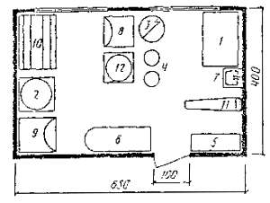 Рис. 39. Постирочная и гладильная мастерская (вариант планировочного решения) 1 - стол рабочий; 2 - центрифуга большая; 3 - электрокотел; 4 - баки для раствора; 5 - шкаф-стеллаж для инструментов и материалов; 6 - ванна; 7 - раковина; 8 - стиральная машина малая; 9 - стиральная машина большая; 10 - сушильный барабан; 11 - доска гладильная; 12 - центрифуга малая При выборе пропорций помещения особое внимание обращается на обеспечение хорошей естественной освещенности рабочих мест. 3.131. Помещение мастерской головных уборов проектируется прямоугольной формы с естественным освещением. Одна сторона его рекомендуется не менее 3 м. Пол мастерской покрывается линолеумом или пластиком. Пример планировки мастерской (участка) изготовления головных уборов приведен на рис. 38. 3.132. Пропиточная, постирочная, сушильная и красильная в практике театров чрезвычайно редко занимают единое помещение. Это обусловлено несовместимостью процессов и различием функциональных связей. Красильный участок по объему производства более всего приближен к живописно-декорационной мастерской; в то же время он постоянно выполняет заказы пошивочной мастерской, более разнообразные, но гораздо меньшие по количеству окрашиваемой ткани. Наилучшая форма помещений - прямоугольная, вытянутая вдоль фронта окон, высота - не менее 3,3 м (в свету), полы с покрытием керамической плиткой (с гидроизоляцией) или асфальтобетонные. В сушильной естественное освещение не требуется. Пример планировки постирочной мастерской (с гладильной) приведен на рис. 39. 3.133. В пастижерской мастерской происходят изготовление, очистка и ремонт изделий из натуральных и синтетических волос. Специальные пастижерские мастерские являются принадлежностью крупных музыкальных театров. В остальных театрах эти работы выполняются дежурными гримерно-парикмахерскими, расположенными вместе с артистическими уборными. Пастижерские мастерские крупных театров имеют в своем составе несколько участков: пастижерский, чистки и подготовки париков, хранения материалов и готовой продукции, примерочный, комнаты (или рабочего места) старшего мастера. Два последних часто совмещаются. 3.134. В живописно-декорационной мастерской изготовляют мягкие фоновые декорации, осуществляют роспись и окраску объемных декораций, бутафории и реквизита (частично), мебели, архитектурных деталей и т.п. В мастерских больших театров могут быть несколько участков: живописный зал, место обработки объемных декораций, место выполнения крупных драпировочных работ, участок плетения сетки, колерная (место подготовки красок), кладовая красок и материалов, комната художников, комната заведующего мастерской (старшего мастера). Живописно-декорационная мастерская, требующая большой площади пола, но не имеющая тяжелого оборудования, может размещаться на любом этаже. Минимально необходимые размеры живописного участка определяются из условий размещения на его площади двух задников (длиной 1,4 ширины игрового портала и шириной 1,4 высоты игрового портала данной сцены), по горизонтали или вертикали (предпочтительнее горизонтальное расположение, так как оно дает возможность писать панорамы) с проходом шириной 1 м вокруг каждого из задников. При этом оставляется место для устройств транспортировки готовых изделий из мастерской и установки швейного оборудования. В