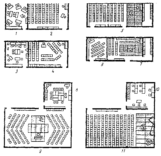 3.161. Помещения ожидания выхода на сцену в трансформируемых залах можно заменять коридором шириной не менее 1,5 м. 3.162. Примерные состав и минимальные площади помещений малого демонстрационного комплекса и помещений, обслуживающих малую сцену, приведены в прил. 4. 3.163. Применение в малых залах трансформации ориентируется на преобладание ручных способов - в этом принципиальное своеобразие трансформации малых залов. Виды, способы и средства трансформации - см. подраздел «Трансформации демонстрационного комплекса». Для залов с глубинной сценой типичен прием трансформации, сохраняющей без изменения зону зрительских мест. В этом случае сцена может видоизменяться путем раскрытия порталов (переход к беспортальной сцене) или перемещения порталов в глубину сцены вдоль ее оси (увеличение или уменьшение глубины), устройства боковых порталов и пр. При проектировании залов с глубинной сценой и вместимостью до 250 зрителей возможно формирование сцены из стационарной части и сборных элементов, составляющих не более половины площади сцены. При переходе к иным типам сцены трансформации могут затрагивать площадь всего малого зала. При любых типах сцены в игровых целях целесообразно использовать галереи, ложи, дверные проемы, проходы в зале и пр. 3.164. К наиболее распространенным средствам трансформации, применяемым в малых залах, относятся переносные стулья и элементы сцены, телескопически складывающиеся трибуны-блитчеры, простейшие поворотные устройства, подвесные секции со зрительскими местами, разделительные экраны и перегородки. В качестве дополнительных средств применяются подъемно-опускные площадки, меняющие рельеф пола зала, кран-балки, подъемники и средства малой механизации, с помощью которых осуществляются перестановки в зале. Переносные стулья и кресла рекомендуется преимущественно применять в залах свободного пространства, но продолжительность и трудоемкость работ ограничивает их применение вместимостью 250 зрителей. Применение подвижных секций, разделительных экранов и перегородок возможно при всех вместимостях зала. Блитчеры рекомендуется применять в залах вместимостью свыше 200 зрителей, а поворотные устройства - свыше 300 зрителей. Рис. 42. Примеры схем малых залов а - трансформации зала на основе передвижных секций зрительских мест; б - залы с нетрансформируемой сценой; в - залы с вращающимися креслами 3.165. Планировочная особенность залов, в которых применяются перечисленные средства трансформации - наличие резерва площади или люфта, увеличивающего площадь малого зала до 7 %. Эта величина складывается из разницы площадей сцен, оборудуемых в зале (глубинной, трехсторонней, центральной) и площади, необходимой для осуществления трансформации и зависящей от выбранного средства или комбинации средств трансформации. Примеры схем малых залов приведены на рис. 42. 3.166. При проектировании помещений малого зала и помещений его обслуживания недостающие в настоящем разделе рекомендации восполняются данными предшествующих разделов. Приложение 1Примерный состав и минимальные площади помещений, м2, театральных зданий