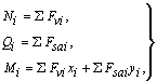 Примечания: 1. К сооружениям с жесткой конструктивной схемой относятся такие, конструкции которых специально приспособлены к восприятию усилий от деформаций оснований, в том числе за счет применения мероприятий, указанных в п. 270,б СНиП 2.02.01-83 «Основания зданий и сооружений». 2. При гибкой конструктивной схеме значение коэффициента gс2 принимается равным единице. 3. При промежуточных значениях L/H коэффициент gс2 определяется по интерполяции. Определение усилий в элементах конструкции 6.16. Для массивной подпорной стены внутренние усилия Ni, Qi и Mi в сечении i-i на глубине уi, определяются по формулам: где SFvi - сумма всех вертикальных сил выше сечения i- i; SFsai - сумма всех горизонтальных сил выше сечения i-i; SFvixi - сумма моментов всех вертикальных сил относительно центра тяжести сечения i-i; SFsaiyi - сумма моментов всех горизонтальных сил относительно центра тяжести сечения i-i.