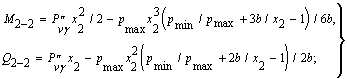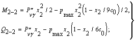 Рис. 3. Определение расчетных усилий в элементах стены а - схема загружения конструкции стены; б - изгибающие моменты в элементах стены; в - поперечные силы в элементах стены Расчетные усилия в фундаментной плите определяем по формулам (53)-(56): Рvg = Pg tg(e + j¢I)/tg e = 45,75 tg(29°+26°)/tg 29° = 117,96 кПа; Pvq = Pq tg(e + j¢I)/tg e = 11,7 tg(29°+26°)/tg 29° = 30,17 кПа; P¢vg = g¢Igfh = 17×1,2×6 = 122,4 кПа; P¢¢vg = g¢Igfd = 17×1,2×1,5 = 30,6 кПа. Сечение 2 - 2 (при х2 = 0,6 м) е = 0,72 м>b/6 = 3,9/6 = 0,65 м; с0 = 0,5b - e = 0,5×3,9 - 0,72 = 1,23 м; М2-2(0,6) = Р¢¢vg = 30,6×0,62/2 - 278,81×0,62(1 - 0,6/9×1,23)/2 = - 41,96 кН×м, где рmax = 2Fv/3c0 = 2×514,4/3×1,23 = 278,81 кПа; Q2-2(0,6) = Р¢¢vgx2 - pmaxx2(1 - х2/6с0) = 30,6×0,6 - 278,81×0,6(1 - 0,6/6×1,23) = - 135,45 кН. Сечение 3 - 3 (при х3 = 3,3 м) при х3 £ x + хb по формуле (45): М3-3 = pmax(3c0 - b + x3)3/18с0