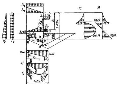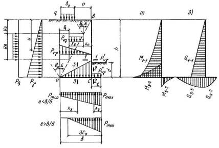 Рис. 9. Расчетная схема уголковой подпорной стены при расчете ее на прочность а - изгибающие моменты; б - поперечные силы б) в случае е < b/6