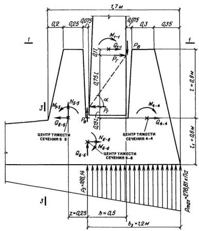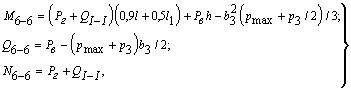 Рис. 8. К расчету щелевого паза Сечение 4 - 4 M4 - 4 = (Pr + Q1 - 1)0,9l = (224,23×0,15×0,9 +165,76×0,25 = 71,71 кН×м; Q4 - 4 = Pr + Q1 - 1 = 224,23 + 129,85 = 354,08 кН. Сечение 5 - 5 M5 - 5 = Pr0,15l + Pвz = 224,23×0,15×0,9 + 165,76×0,25 = 71,71 кН×м; Q5 - 5 = Pr = 224,23 кН; N5 - 5 = Pв = 165,76 кН. Сечение 6 - 6 M6 -6 = (Pr + Q1 - 1)(0,9l + 0,5l1) + Pвh - b32(pmax + p3/2)/3 = 224,23 + +129,85)(0,9×0,9 + 0,5×0,6) + 165,76×0,5 - 1,22(278,81 + 188,14/2)/3 = =296,93 кН×м, где p3 = (1 - b3/3c0)pmax = (1 - 1,2/3×1,23)278,81 = 188,14 кПа; Q6 - 6= Pв - (pmax + p3) b3 /2 = =165,76 - 27,81 +188,14)1,2/2 = -144,41 кН; N6 - 6 = Pr + Q1 - 1 = 224,23 + 129,85 = 354,08 кН. Расчет правой стенки паза Расчет производим так же, как и расчет изгибаемого консольного элемента (рис. 9). 1. На действие поперечной силы Q4 - 4 = 354,08 кН: а) проверяем выполнение условия (1) в соответствии с формулой (72) СНиП 2.03.01-84*: