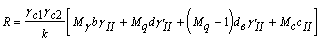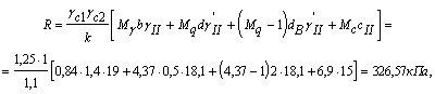 Мс - изгибающий момент на уровне перекрытия. Сдвигающую силу Fsa и изгибающий момент М0 в уровне подошвы следует определять по формулам: Fsa = - R + (Pg3 + 2Рq)(h2 + h3)/2; (95) М0 = -RH + Pqh2/2 + Рg3h2/6 - Ge + Mc. (96) 7.14. Расчетные усилия в конструктивных элементах подвала (ригелях, колоннах, плитах перекрытия, фундаментах и т.п.) следует определять по известным правилам строительной механики. 7.15. Расчет оснований при деформациях производит по п. 6.14. 7.16. Расчетное сопротивление грунта основания R, кПа, определяется по формуле