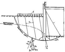 Рис. 15. Расчетная схема для определения устойчивости стены подвала против сдвига по круглоцилиндрическим поверхностям 9.3. Для расчета стен подвалов рассматриваемый участок разбивается параллельными отрезками: вертикальными (без учета сейсмичности) и направленными по угол w к вертикали (с учетом сейсмичности района). Устойчивость против сдвига по рассматриваемой кривой считается обеспеченной, если при учете сейсмического воздействия и фильтрационного давления грунтовых вод удовлетворяется следующее условие: знак "плюс" соответствует нисходящей, а знак "минус" - восходящей ветви кривой сдвига, gic и gwic - равнодействующие сил, действующих на подошву i-го элемента с учетом сейсмического воздействия: