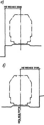 Рис. 18. Габариты приближения железнодорожного пути до выступающих частей подпорных стен а - при расположении железнодорожного пути на насыпи; б - то же, в полувыемке Грунты засыпки необходимо трамбовать послойно до тех пор, пока величина коэффициента уплотнения kу будет не менее 0,95. Не допускается применять для обратных засыпок тяжелые и пластичные глины, а также грунты, содержащие более 5 % по весу органических и растворимых включений. 10.13. Высота подпорных стен для грузовых рамп автомобильного транспорта со стороны подъезда автомобилей должна быть равной 1200 мм от уровня поверхности проезжей части дороги или погрузочно-разгрузочной площадки (рис. 17). 10.14. Высота подпорных стен для грузовых и пассажирских рамп железнодорожного транспорта от уровня головки рельсов должна быть равной 1100 мм для колеи 1520 мм и 750 мм для колеи 750 мм. Горизонтальное расстояние от оси ближайшего железнодорожного пути до наружного края рампы должно быть равно 1920 мм и 1370 мм соответственно для железнодорожной колеи шириной 1520 мм и 750 мм. 10.15. В насыпях на прямых участках минимальное расстояние от оси ближайшего железнодорожного пути до верха наружной грани подпорной стены следует принимать не менее 2,5 м (рис. 18). 10.16. В выемках на прямых участках минимальное расстояние от оси ближайшего железнодорожного пути до выступающих частей подпорной степи на уровне подошв шпал и выше должно быть не менее 3,1 м. 10.17. На кривых участках минимальные расстояния от оси ближайшего железнодорожного пути до подпорной стены необходимо увеличить в соответствии с табл. 9. Таблица 9